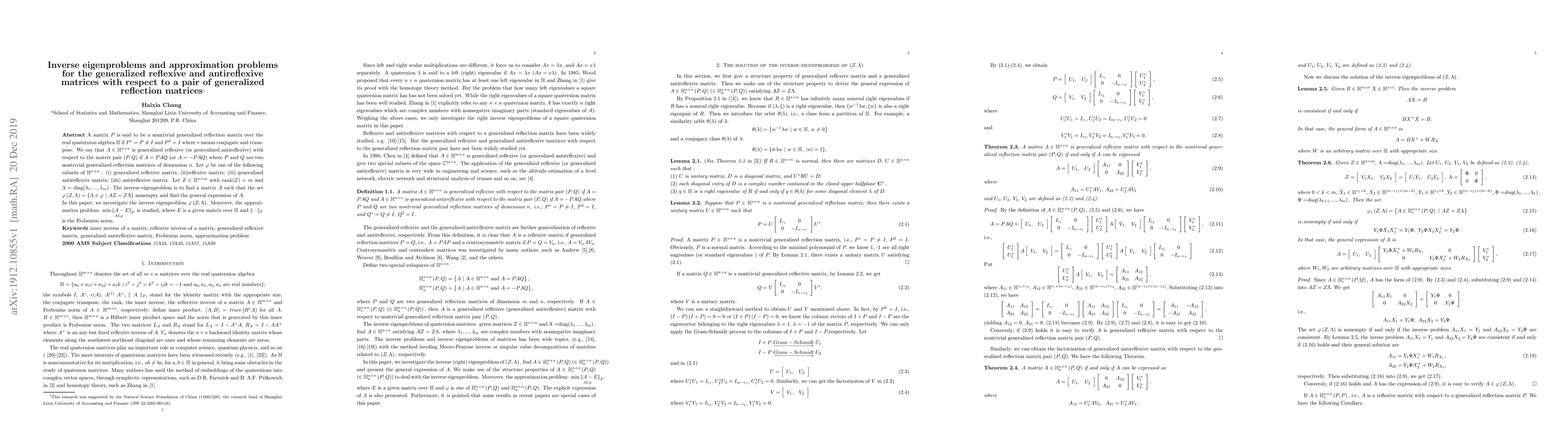 A matrix $P$ is said to be a nontrivial generalized reflection matrix over the real quaternion algebra $\mathbb{H}$ if $P^{\ast }=P\neq I$ and $P^{2}=I$ where $\ast$ means conjugate and transpose. We say that $A\in\mathbb{H}^{n\times n}$ is generalized reflexive (or generalized antireflexive) with respect to the matrix pair $(P,Q)$ if $A=PAQ$ $($or $A=-PAQ)$ where $P$ and $Q$ are two nontrivial generalized reflection matrices of demension $n$. Let ${\large \varphi}$ be one of the following subsets of $\mathbb{H}^{n\times n}$ : (i) generalized reflexive matrix; (ii)reflexive matrix; (iii) generalized antireflexive matrix; (iiii) antireflexive matrix. Let $Z\in\mathbb{H}^{n\times m}$ with rank$\left( Z\right) =m$ and $\Lambda=$ diag$\left( \lambda_{1},...,\lambda_{m}\right) .$ The inverse eigenproblem is to find a\ matrix $A$ such that the set ${\large \varphi }\left( Z,\Lambda\right) =\left\{ A\in{\large \varphi}\text{ }|\text{ }AZ=Z\Lambda\right\} $ nonempty and find the general expression of $A.$\newline In this paper, we investigate the inverse eigenproblem ${\large \varphi}\left( Z,\Lambda\right) $. Moreover, the approximation problem: $\underset{A\in{\large \varphi}}{\min\left\Vert A-E\right\Vert _{F}}$ is studied, where $E$ is a given matrix over $\mathbb{H}$\ and $\parallel \cdot\parallel_{F}$ is the Frobenius norm.