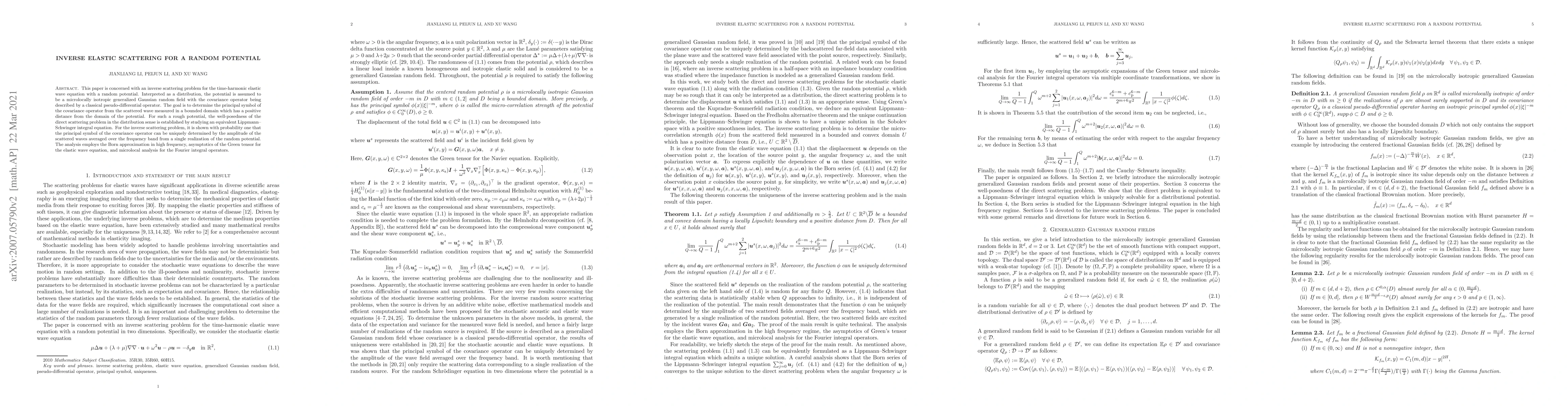 This paper investigates an inverse scattering problem for the time-harmonic elastic wave equation with a random potential, showing that the principal symbol of the covariance operator can be uniquely determined from scattered wave measurements, leveraging high-frequency Born approximation and microlocal analysis.