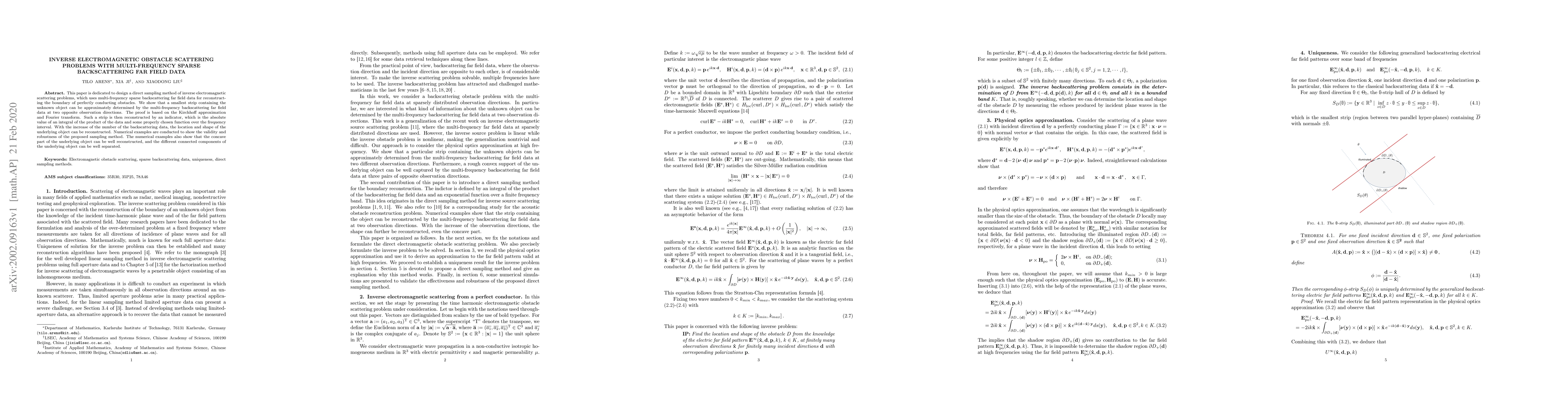 This paper is dedicated to design a direct sampling method of inverse electromagnetic scattering problems, which uses multi-frequency sparse backscattering far field data for reconstructing the boundary of perfectly conducting obstacles. We show that a smallest strip containing the unknown object can be approximately determined by the multi-frequency backscattering far field data at two opposite observation directions. The proof is based on the Kirchhoff approximation and Fourier transform. Such a strip is then reconstructed by an indicator, which is the absolute value of an integral of the product of the data and some properly chosen function over the frequency interval. With the increase of the number of the backscattering data, the location and shape of the underlying object can be reconstructed. Numerical examples are conducted to show the validity and robustness of the proposed sampling method. The numerical examples also show that the concave part of the underlying object can be well reconstructed, and the different connected components of the underlying object can be well separated.