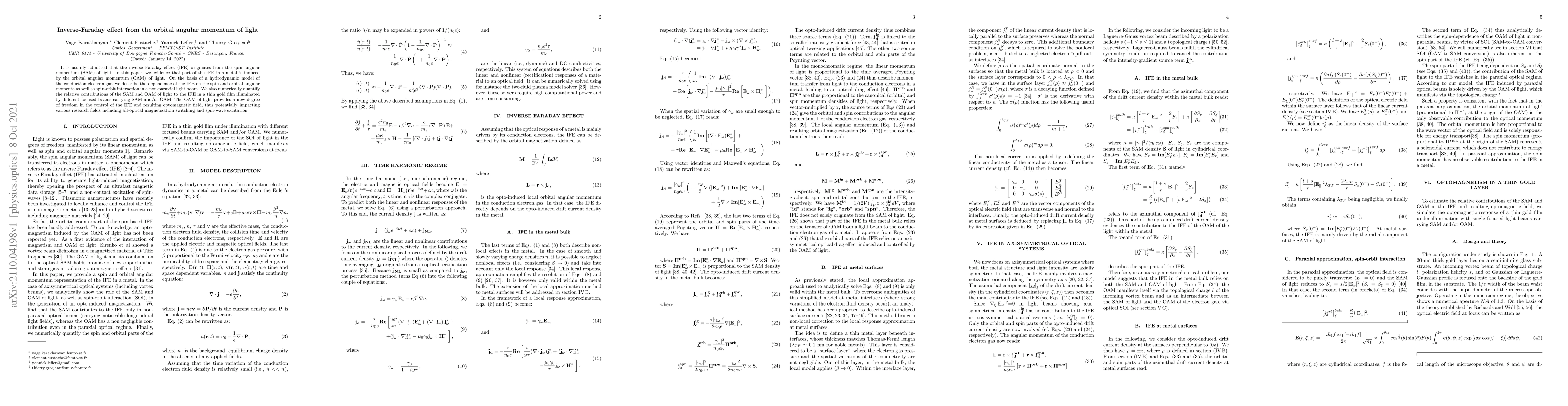 This paper demonstrates that the inverse Faraday effect (IFE) in metals is partially induced by the orbital angular momentum (OAM) of light, not just the spin angular momentum (SAM). Using a hydrodynamic model, the authors quantify the contributions of SAM and OAM to IFE in a thin gold film, revealing OAM as a new control parameter for optomagnetic fields with potential applications in all-optical magnetization switching and spin-wave excitation.