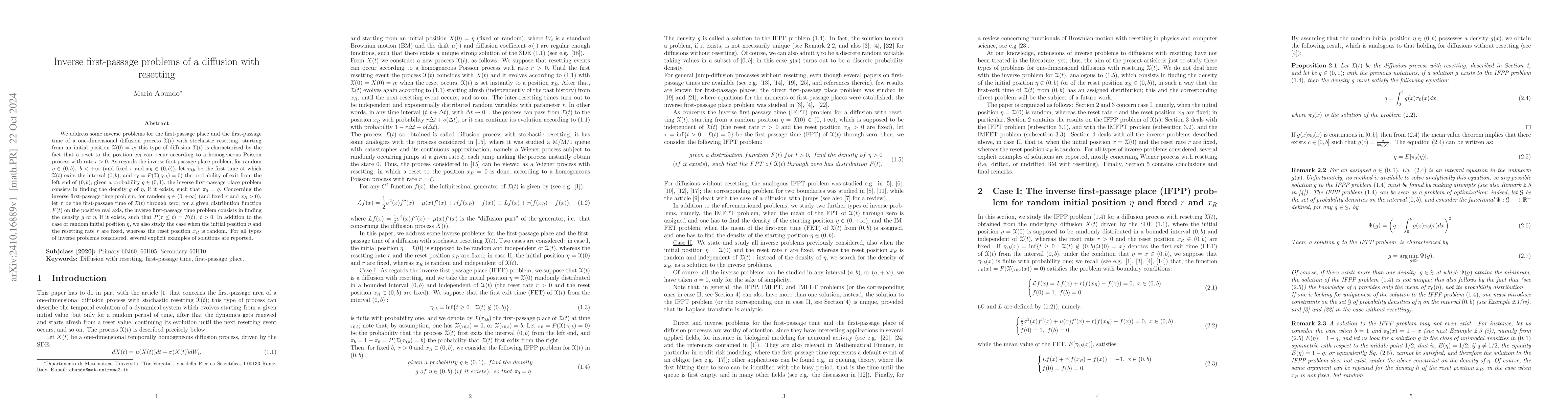 We address some inverse problems for the first-passage place and the first-passage time of a one-dimensional diffusion process $\mathcal X(t)$ with stochastic resetting, starting from an initial position $\mathcal X(0)= \eta ;$ this type of diffusion $\mathcal X(t)$ is characterized by the fact that a reset to the position $x_R $ can occur according to a homogeneous Poisson process with rate $r>0.$ As regards the inverse first-passage place problem, for random $\eta \in (0,b), \ b < + \infty$ (and fixed $r$ and $x_R \in (0,b))$, let $\tau_{0,b}$ be the first time at which $\mathcal X(t)$ exits the interval $(0,b),$ and $\pi _0 = P(\mathcal X(\tau_{0,b}) = 0)$ the probability of exit from the left end of $(0,b);$ given a probability $q \in (0,1),$ the inverse first-passage place problem consists in finding the density $g$ of $\eta ,$ if it exists, such that $\pi _0 = q.$ Concerning the inverse first-passage time problem, for random $\eta \in (0, + \infty)$ (and fixed $r$ and $x_R >0)$, let $\tau$ be the first-passage time of $\mathcal X(t)$ through zero; for a given distribution function $F(t)$ on the positive real axis, the inverse first-passage time problem consists in finding the density $g$ of $\eta,$ if it exists, such that $P(\tau \le t ) = F(t), \ t >0.$ In addition to the case of random initial position $\eta,$ we also study the case when the initial position $\eta$ and the resetting rate $r$ are fixed, whereas the reset position $x_R$ is random. For all types of inverse problems considered, several explicit examples of solutions are reported.