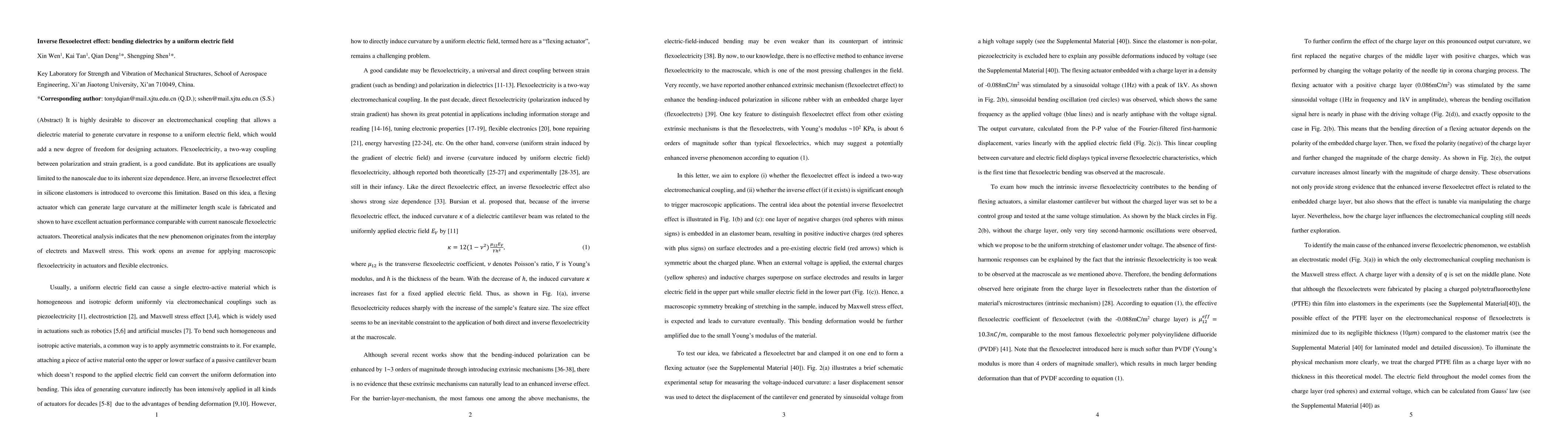 It is highly desirable to discover an electromechanical coupling that allows a dielectric material to generate curvature in response to a uniform electric field, which would add a new degree of freedom for designing actuators. Flexoelectricity, a two-way coupling between polarization and strain gradient, is a good candidate. But its applications are usually limited to the nanoscale due to its inherent size dependence. Here, an inverse flexoelectret effect in silicone elastomers is introduced to overcome this limitation. Based on this idea, a flexing actuator which can generate large curvature at the millimeter length scale is fabricated and shown to have excellent actuation performance comparable with current nanoscale flexoelectric actuators. Theoretical analysis indicates that the new phenomenon originates from the interplay of electrets and Maxwell stress. This work opens an avenue for applying macroscopic flexoelectricity in actuators and flexible electronics.