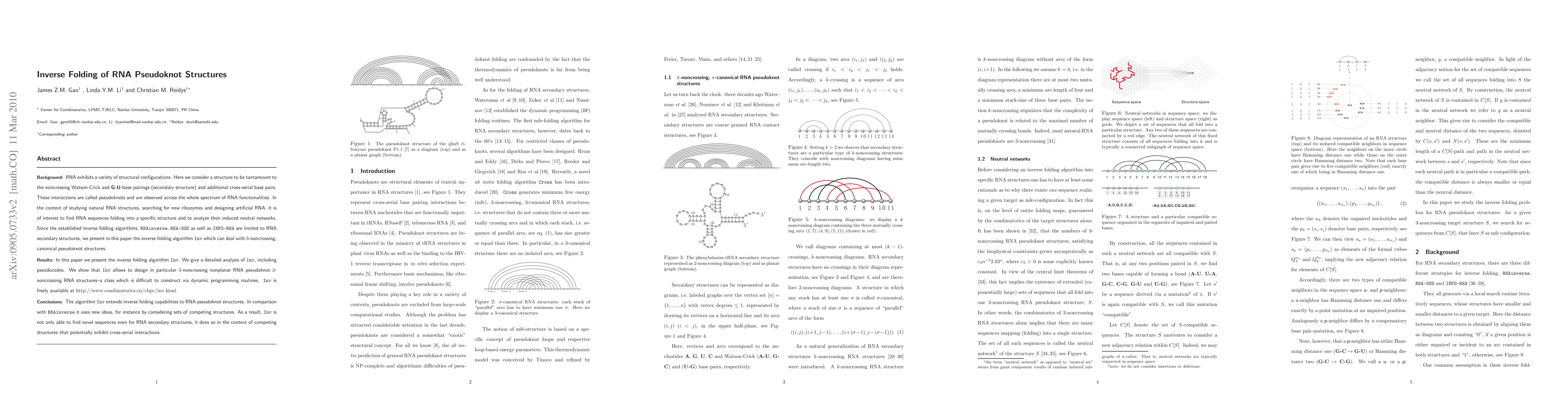 Background: RNA exhibits a variety of structural configurations. Here we consider a structure to be tantamount to the noncrossing Watson-Crick and \pairGU-base pairings (secondary structure) and additional cross-serial base pairs. These interactions are called pseudoknots and are observed across the whole spectrum of RNA functionalities. In the context of studying natural RNA structures, searching for new ribozymes and designing artificial RNA, it is of interest to find RNA sequences folding into a specific structure and to analyze their induced neutral networks. Since the established inverse folding algorithms, {\tt RNAinverse}, {\tt RNA-SSD} as well as {\tt INFO-RNA} are limited to RNA secondary structures, we present in this paper the inverse folding algorithm {\tt Inv} which can deal with 3-noncrossing, canonical pseudoknot structures. Results: In this paper we present the inverse folding algorithm {\tt Inv}. We give a detailed analysis of {\tt Inv}, including pseudocodes. We show that {\tt Inv} allows to design in particular 3-noncrossing nonplanar RNA pseudoknot 3-noncrossing RNA structures-a class which is difficult to construct via dynamic programming routines. {\tt Inv} is freely available at \url{http://www.combinatorics.cn/cbpc/inv.html}. Conclusions: The algorithm {\tt Inv} extends inverse folding capabilities to RNA pseudoknot structures. In comparison with {\tt RNAinverse} it uses new ideas, for instance by considering sets of competing structures. As a result, {\tt Inv} is not only able to find novel sequences even for RNA secondary structures, it does so in the context of competing structures that potentially exhibit cross-serial interactions.
