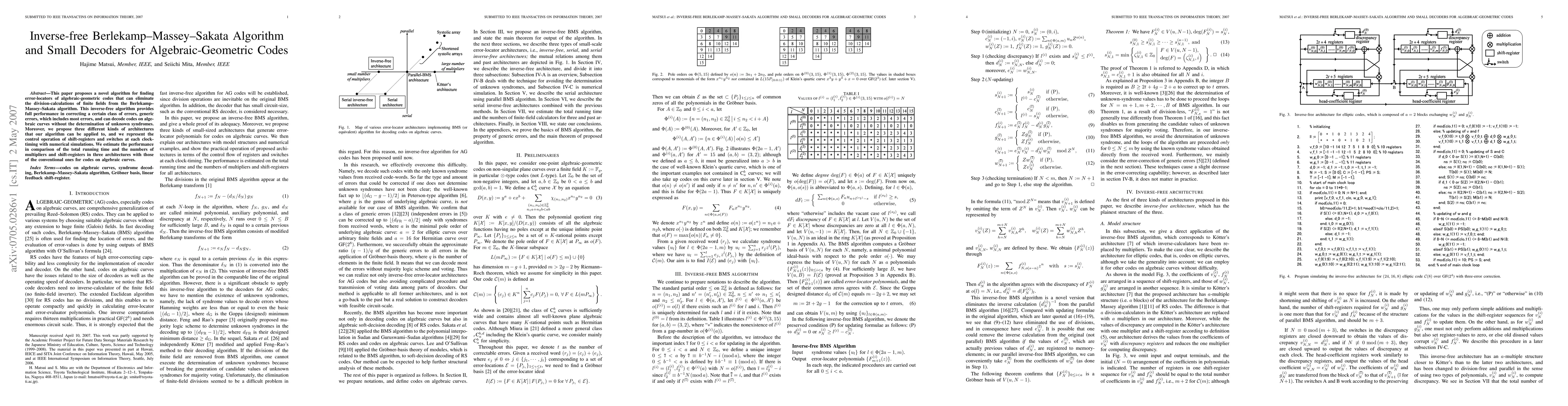 This paper proposes a novel algorithm for finding error-locators of algebraic-geometric codes that can eliminate the division-calculations of finite fields from the Berlekamp-Massey-Sakata algorithm. This inverse-free algorithm provides full performance in correcting a certain class of errors, generic errors, which includes most errors, and can decode codes on algebraic curves without the determination of unknown syndromes. Moreover, we propose three different kinds of architectures that our algorithm can be applied to, and we represent the control operation of shift-registers and switches at each clock-timing with numerical simulations. We estimate the performance in comparison of the total running time and the numbers of multipliers and shift-registers in three architectures with those of the conventional ones for codes on algebraic curves.
