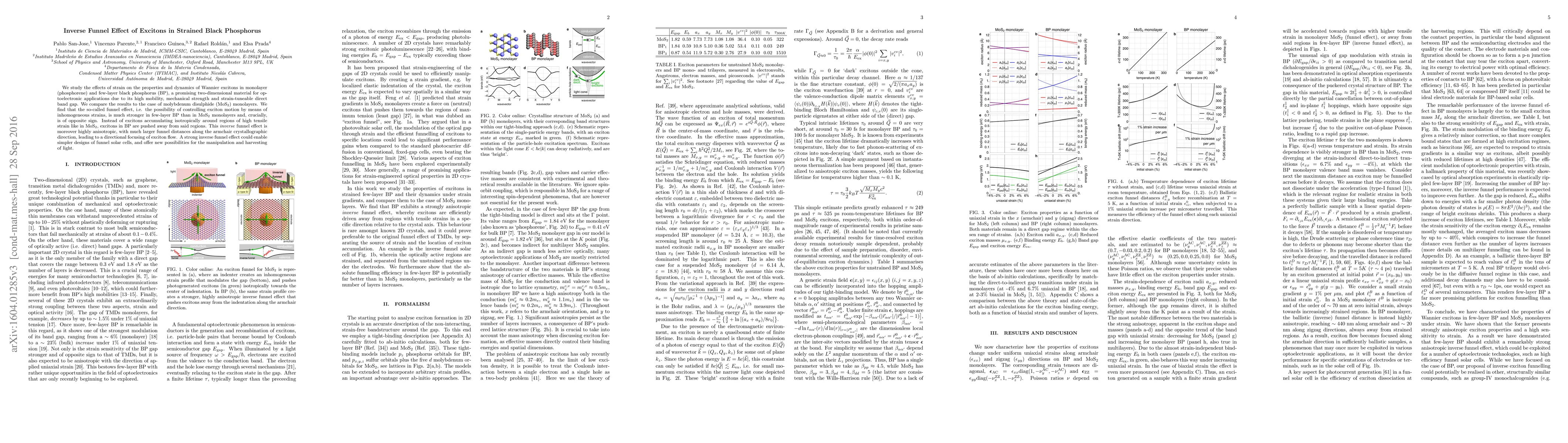 We study the effects of strain on the properties and dynamics of Wannier excitons in monolayer (phosphorene) and few-layer black phosphorus (BP), a promising two-dimensional material for optoelectronic applications due to its high mobility, mechanical strength and strain-tuneable direct band gap. We compare the results to the case of molybdenum disulphide (MoS$_2$) monolayers. We find that the so-called funnel effect, i.e. the possibility of controlling exciton motion by means of inhomogeneous strains, is much stronger in few-layer BP than in MoS$_2$ monolayers and, crucially, is of opposite sign. Instead of excitons accumulating isotropically around regions of high tensile strain like in MoS$_2$, excitons in BP are pushed away from said regions. This \emph{inverse} funnel effect is moreover highly anisotropic, with much larger funnel distances along the armchair crystallographic direction, leading to a directional focusing of exciton flow. A strong inverse funnel effect could enable simpler designs of funnel solar cells, and offer new possibilities for the manipulation and harvesting of light.