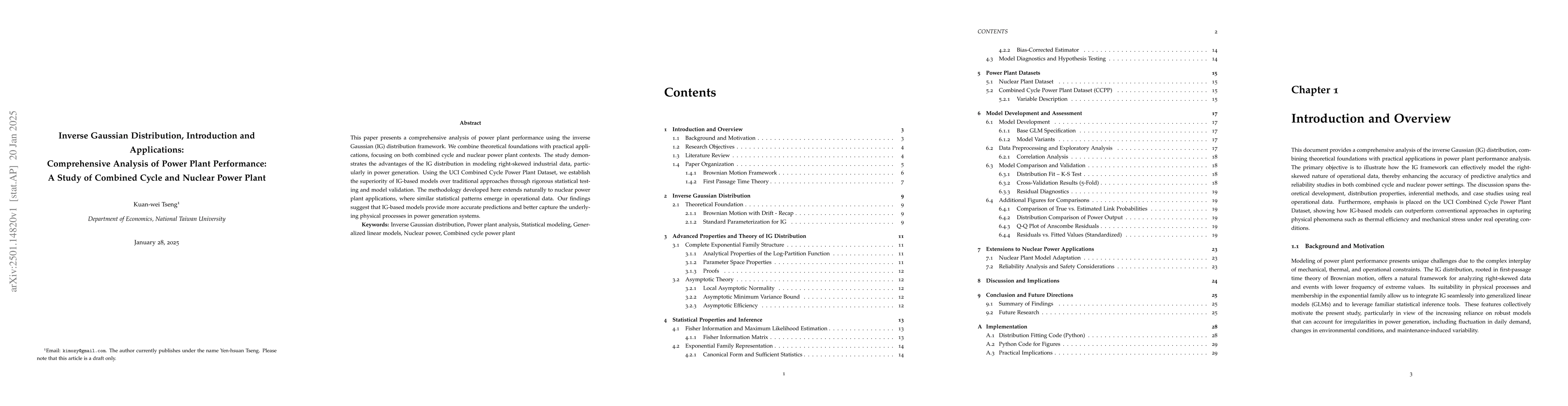 This paper presents a comprehensive analysis of power plant performance using the inverse Gaussian (IG) distribution framework. We combine theoretical foundations with practical applications, focusing on both combined cycle and nuclear power plant contexts. The study demonstrates the advantages of the IG distribution in modeling right-skewed industrial data, particularly in power generation. Using the UCI Combined Cycle Power Plant Dataset, we establishthe superiority of IG-based models over traditional approaches through rigorous statistical testing and model validation. The methodology developed here extends naturally to nuclear power plant applications, where similar statistical patterns emerge in operational data. Our findings suggest that IG-based models provide more accurate predictions and better capture the underlying physical processes in power generation systems.