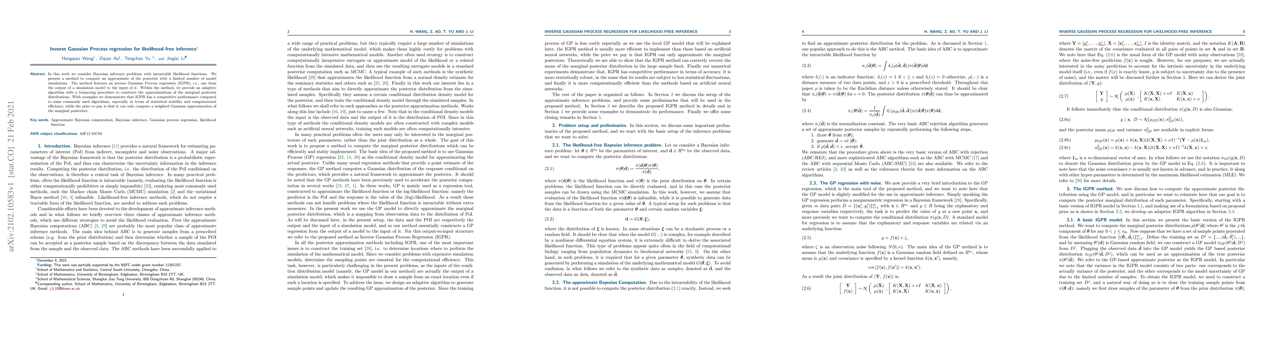 This paper introduces an inverse Gaussian Process regression (IGPR) method for likelihood-free Bayesian inference, offering an adaptive algorithm with tempering to approximate posterior distributions efficiently. The method demonstrates competitive performance in statistical stability and computational efficiency compared to other algorithms.