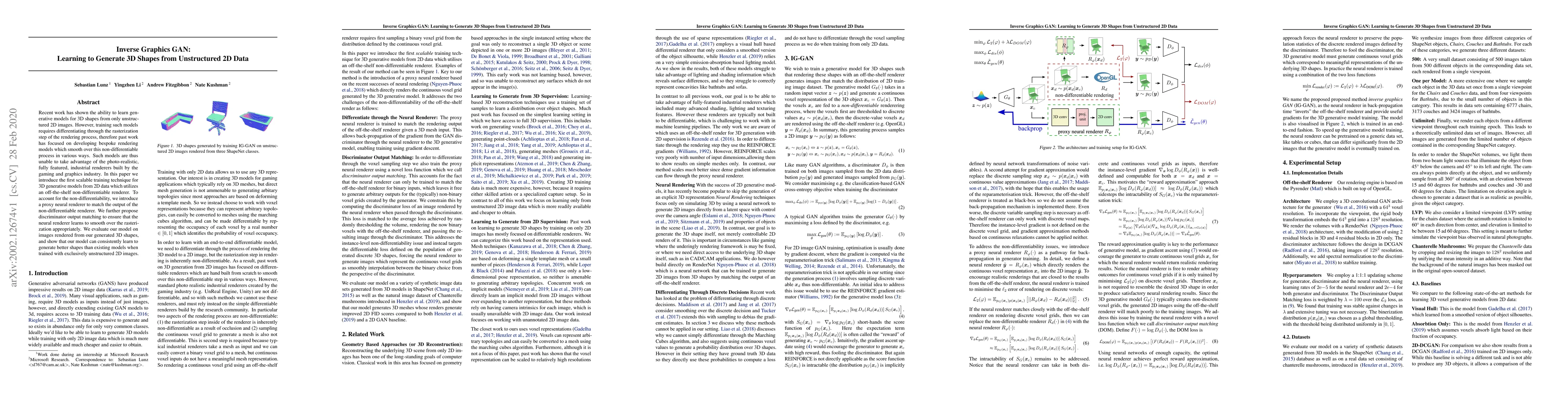 This paper introduces a scalable training technique for 3D generative models using off-the-shelf non-differentiable renderers, employing a proxy neural renderer and discriminator output matching to overcome rasterization challenges. The proposed method outperforms existing models in generating 3D shapes from unstructured 2D images.