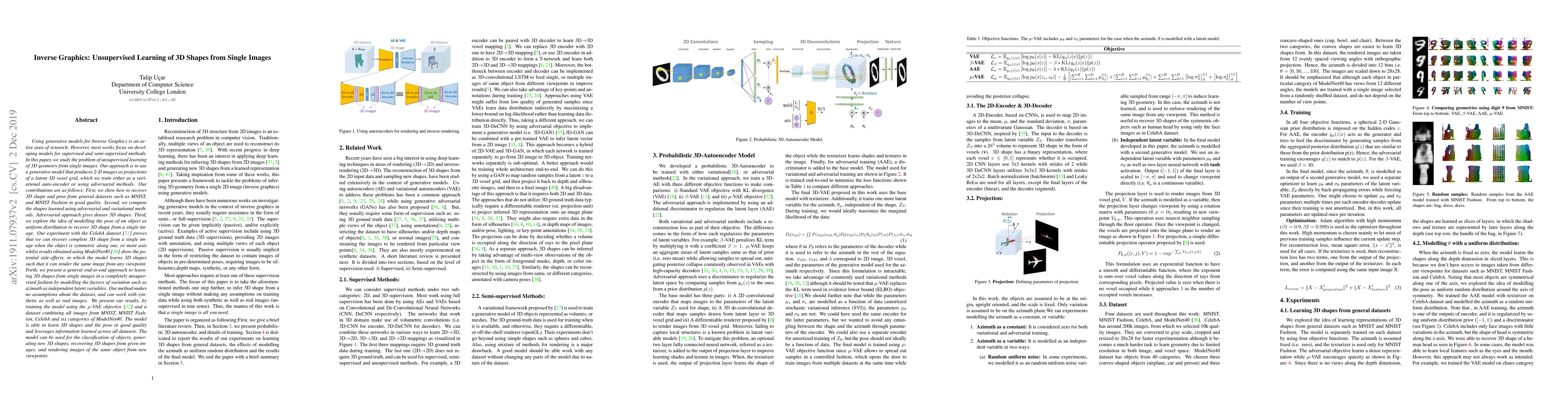 Using generative models for Inverse Graphics is an active area of research. However, most works focus on developing models for supervised and semi-supervised methods. In this paper, we study the problem of unsupervised learning of 3D geometry from single images. Our approach is to use a generative model that produces 2-D images as projections of a latent 3D voxel grid, which we train either as a variational auto-encoder or using adversarial methods. Our contributions are as follows: First, we show how to recover 3D shape and pose from general datasets such as MNIST, and MNIST Fashion in good quality. Second, we compare the shapes learned using adversarial and variational methods. Adversarial approach gives denser 3D shapes. Third, we explore the idea of modelling the pose of an object as uniform distribution to recover 3D shape from a single image. Our experiment with the CelebA dataset \cite{liu2015faceattributes} proves that we can recover complete 3D shape from a single image when the object is symmetric along one, or more axis whilst results obtained using ModelNet40 \cite{wu20153d} show the potential side-effects, in which the model learns 3D shapes such that it can render the same image from any viewpoint. Forth, we present a general end-to-end approach to learning 3D shapes from single images in a completely unsupervised fashion by modelling the factors of variation such as azimuth as independent latent variables. Our method makes no assumptions about the dataset, and can work with synthetic as well as real images (i.e. unsupervised in true sense). We present our results, by training the model using the $\mu$-VAE objective \cite{ucar2019bridging} and a dataset combining all images from MNIST, MNIST Fashion, CelebA and six categories of ModelNet40. The model is able to learn 3D shapes and the pose in qood quality and leverages information learned across all datasets.