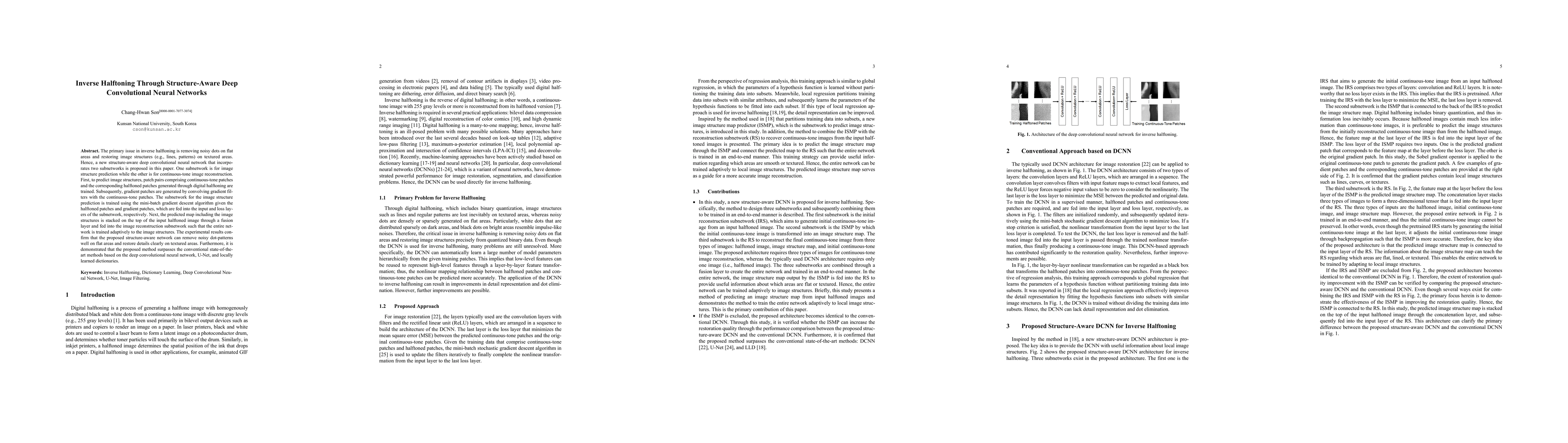This paper proposes a structure-aware deep convolutional neural network with two subnetworks for inverse halftoning, effectively removing noisy dots from flat areas and restoring image structures on textured areas. The network outperforms conventional methods, achieving better detail restoration and dot-pattern removal.