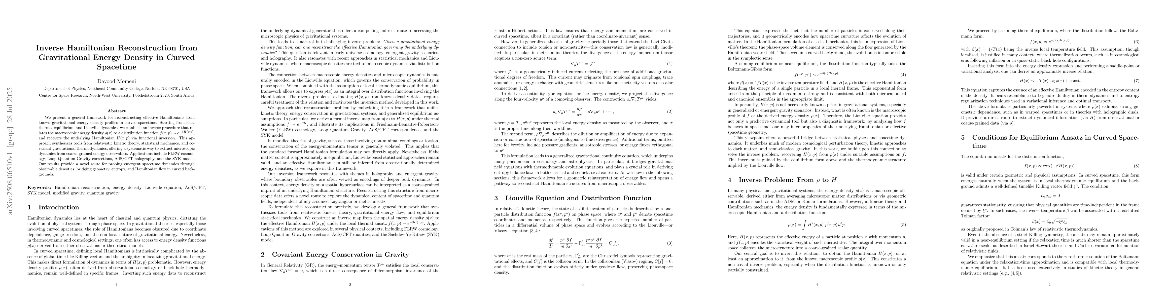 We present a general framework for reconstructing effective Hamiltonians from known gravitational energy density profiles in curved spacetime. Starting from local thermal equilibrium and Liouville dynamics, we establish an inverse procedure that relates the macroscopic energy density \( \rho(x) \) to a distribution function \( f(x,p) \sim e^{-\beta H(x,p)} \), and recovers the underlying Hamiltonian \( H(x,p) \) via functional inversion. This approach synthesizes tools from relativistic kinetic theory, statistical mechanics, and covariant gravitational thermodynamics, offering a systematic way to extract microscopic dynamics from coarse-grained energy observables. Applications include FLRW cosmology, Loop Quantum Gravity corrections, AdS/CFT holography, and the SYK model. Our results provide a novel route for probing emergent spacetime dynamics through observable densities, bridging geometry, entropy, and Hamiltonian flow in curved backgrounds.