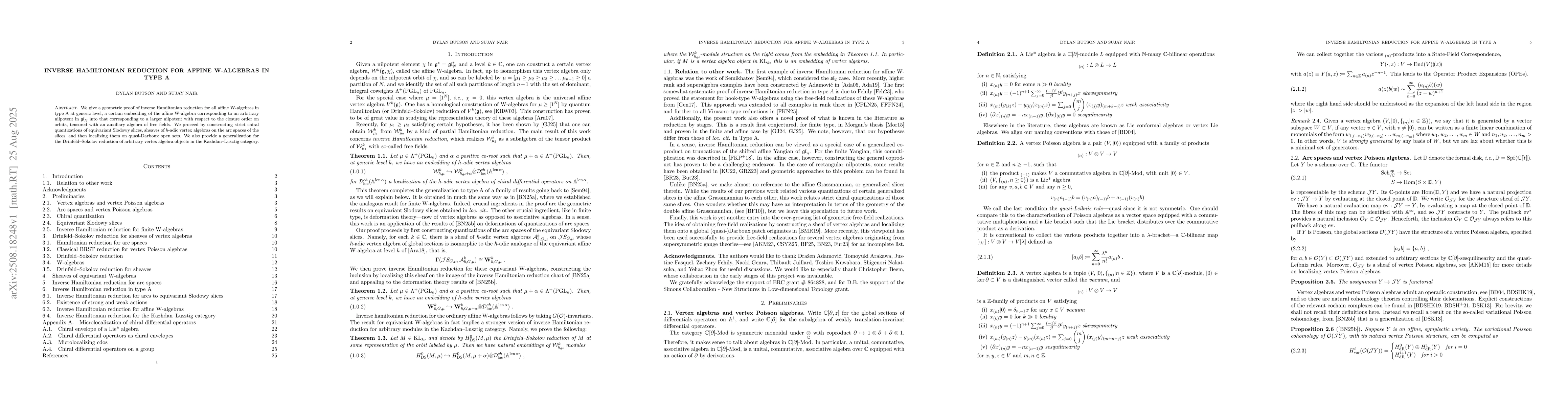 We give a geometric proof of inverse Hamiltonian reduction for all affine W-algebras in type A at generic level, a certain embedding of the affine W-algebra corresponding to an arbitrary nilpotent in $\mathfrak{gl}_N$ into that corresponding to a larger nilpotent with respect to the closure order on orbits, tensored with an auxiliary algebra of free fields. We proceed by constructing strict chiral quantizations of equivariant Slodowy slices, sheaves of $\hbar$-adic vertex algebras on the arc spaces of the slices, and then localizing them on quasi-Darboux open sets. We also provide a generalization for the Drinfeld-Sokolov reduction of arbitrary vertex algebra objects in the Kazhdan-Lusztig category.