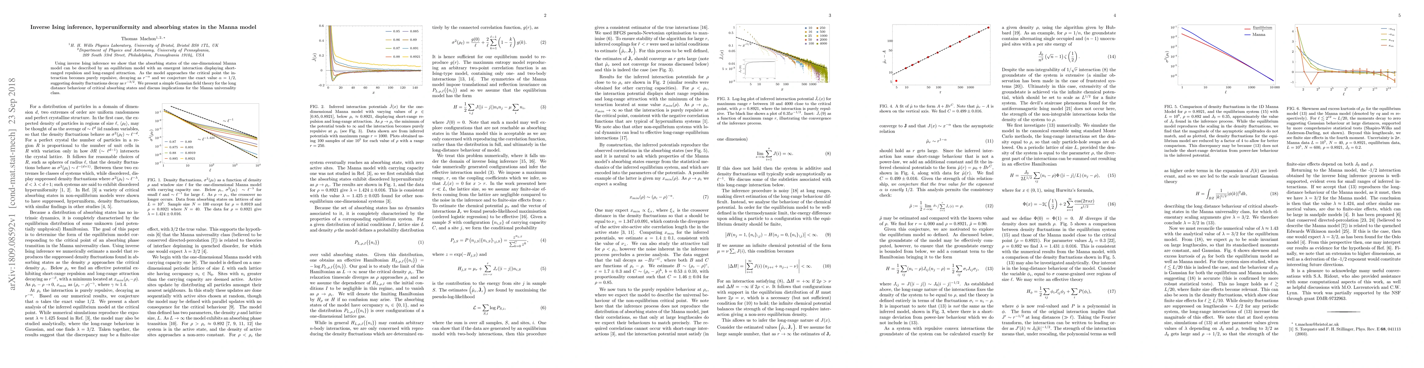 Using inverse Ising inference we show that the absorbing states of the one-dimensional Manna model can be described by an equilibrium model with an emergent interaction displaying short-ranged repulsion and long-ranged attraction. As the model approaches the critical point the interaction becomes purely repulsive, decaying as $r^{-\alpha}$ and we conjecture the exact value $\alpha=1/2$, suggesting density fluctuations decay as $r^{-3/2}$. We present a simple Gaussian field theory for the long distance behaviour of critical absorbing states and discuss implications for the Manna universality class.