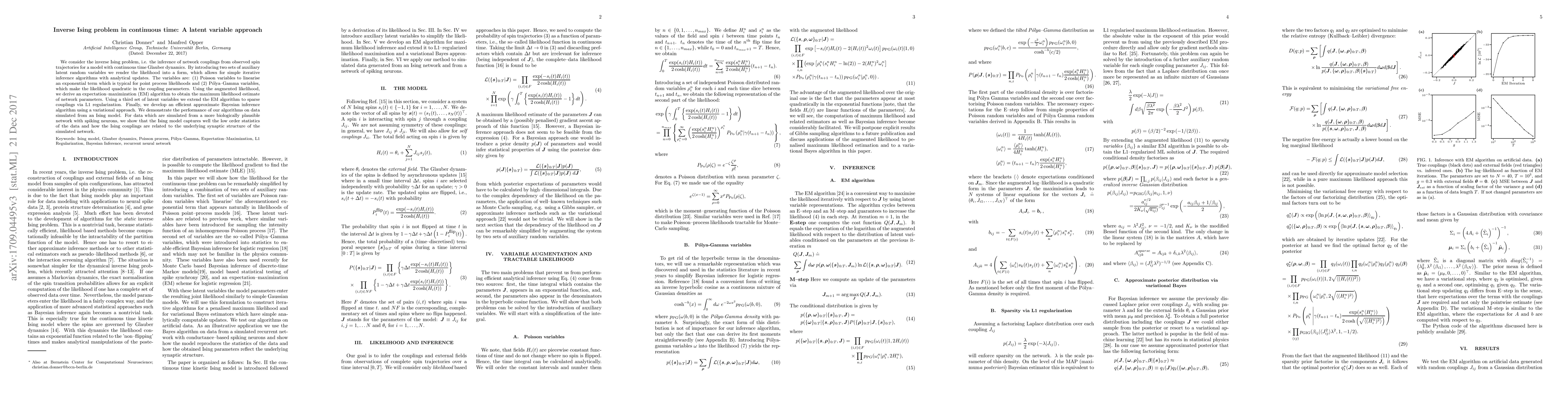 We consider the inverse Ising problem, i.e. the inference of network couplings from observed spin trajectories for a model with continuous time Glauber dynamics. By introducing two sets of auxiliary latent random variables we render the likelihood into a form, which allows for simple iterative inference algorithms with analytical updates. The variables are: (1) Poisson variables to linearise an exponential term which is typical for point process likelihoods and (2) P\'olya-Gamma variables, which make the likelihood quadratic in the coupling parameters. Using the augmented likelihood, we derive an expectation-maximization (EM) algorithm to obtain the maximum likelihood estimate of network parameters. Using a third set of latent variables we extend the EM algorithm to sparse couplings via L1 regularization. Finally, we develop an efficient approximate Bayesian inference algorithm using a variational approach. We demonstrate the performance of our algorithms on data simulated from an Ising model. For data which are simulated from a more biologically plausible network with spiking neurons, we show that the Ising model captures well the low order statistics of the data and how the Ising couplings are related to the underlying synaptic structure of the simulated network.