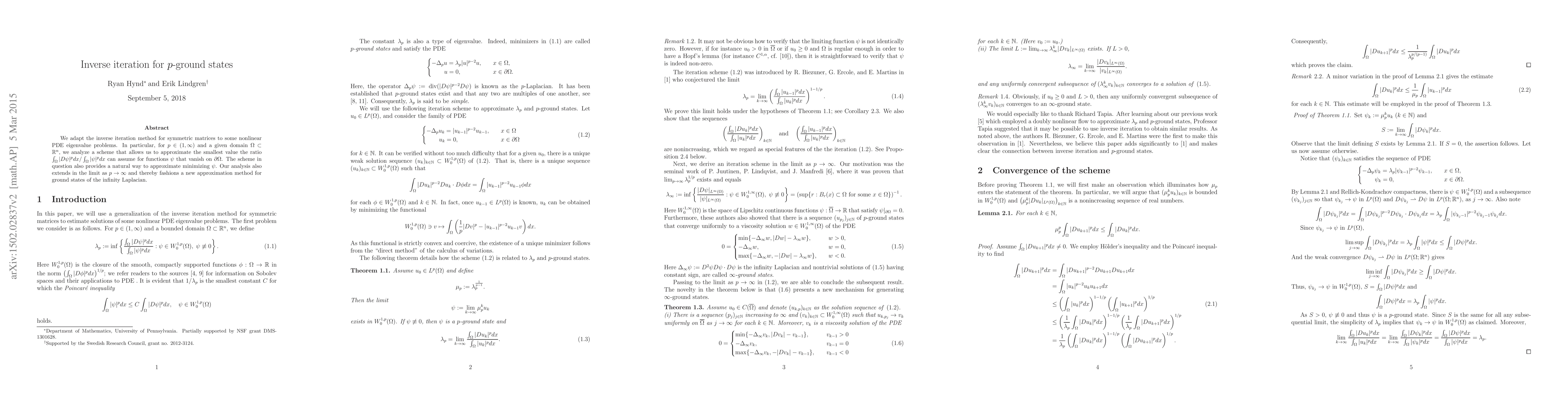 We adapt the inverse iteration method for symmetric matrices to some nonlinear PDE eigenvalue problems. In particular, for $p\in (1,\infty)$ and a given domain $\Omega\subset\mathbb{R}^n$, we analyze a scheme that allows us to approximate the smallest value the ratio $\int_\Omega|D\psi|^p dx/\int_\Omega|\psi|^p dx$ can assume for functions $\psi$ that vanish on $\partial \Omega$. The scheme in question also provides a natural way to approximate minimizing $\psi$. Our analysis also extends in the limit as $p\rightarrow\infty$ and thereby fashions a new approximation method for ground states of the infinity Laplacian.