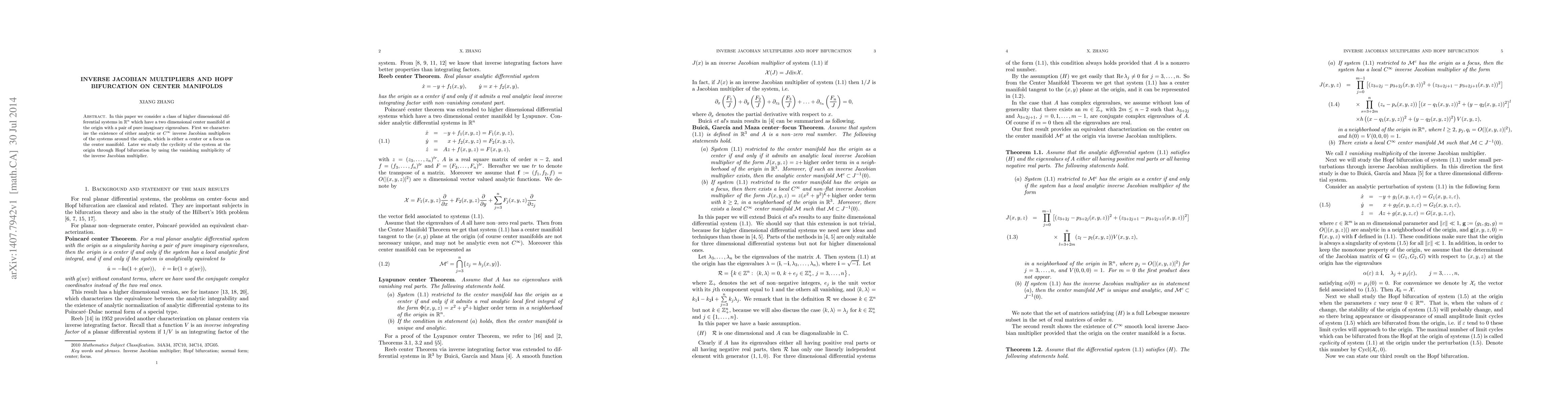 This paper investigates higher-dimensional differential systems with a two-dimensional center manifold and pure imaginary eigenvalues, focusing on the existence of inverse Jacobian multipliers and analyzing Hopf bifurcation to determine system cyclicity.