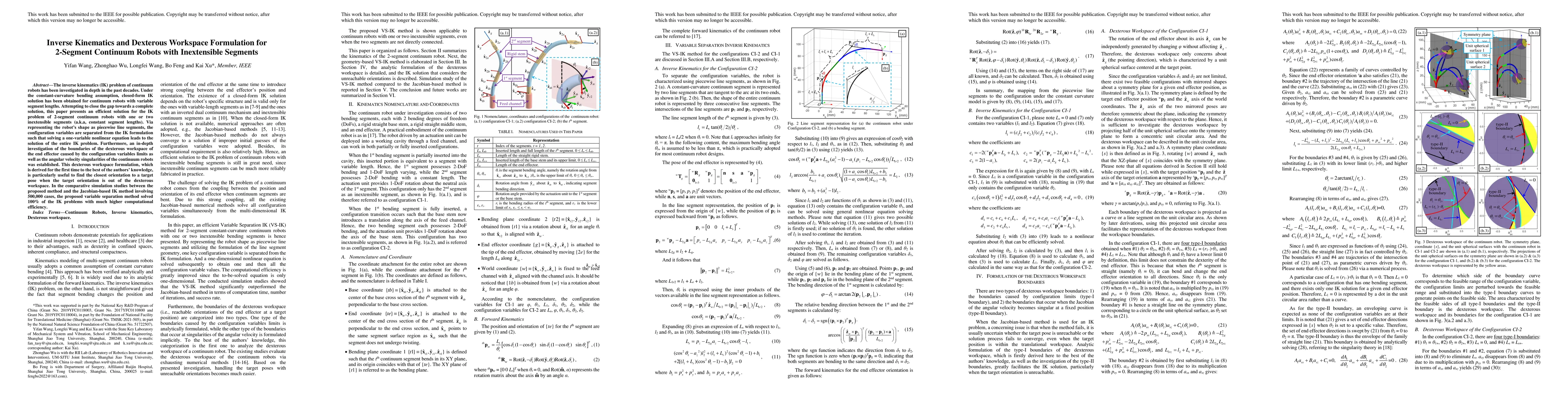The inverse kinematics (IK) problem of continuum robots has been investigated in depth in the past decades. Under the constant-curvature bending assumption, closed-form IK solution has been obtained for continuum robots with variable segment lengths. Attempting to close the gap towards a complete solution, this paper presents an efficient solution for the IK problem of 2-segment continuum robots with one or two inextensible segments (a.k.a, constant segment lengths). Via representing the robot's shape as piecewise line segments, the configuration variables are separated from the IK formulation such that solving a one-variable nonlinear equation leads to the solution of the entire IK problem. Furthermore, an in-depth investigation of the boundaries of the dexterous workspace of the end effector caused by the configuration variables limits as well as the angular velocity singularities of the continuum robots was established. This dexterous workspace formulation, which is derived for the first time to the best of the authors' knowledge, is particularly useful to find the closest orientation to a target pose when the target orientation is out of the dexterous workspace. In the comparative simulation studies between the proposed method and the Jacobian-based IK method involving 500,000 cases, the proposed variable separation method solved 100% of the IK problems with much higher computational efficiency.