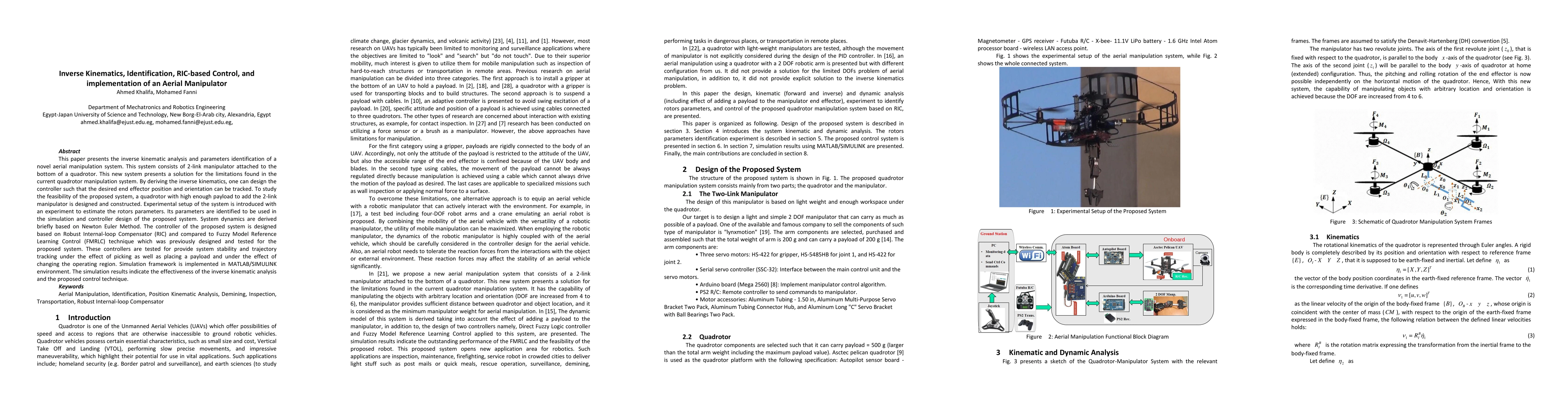 This paper presents the inverse kinematic analysis and parameters identification of a novel aerial manipulation system. This system consists of 2-link manipulator attached to the bottom of a quadrotor. This new system presents a solution for the limitations found in the current quadrotor manipulation system. By deriving the inverse kinematics, one can design the controller such that the desired end effector position and orientation can be tracked. To study the feasibility of the proposed system, a quadrotor with high enough payload to add the 2-link manipulator is designed and constructed. Experimental setup of the system is introduced with an experiment to estimate the rotors parameters. Its parameters are identified to be used in the simulation and controller design of the proposed system. System dynamics are derived briefly based on Newton Euler Method. The controller of the proposed system is designed based on Robust Internal-loop Compensator (RIC) and compared to Fuzzy Model Reference Learning Control (FMRLC) technique which was previously designed and tested for the proposed system. These controllers are tested for provide system stability and trajectory tracking under the effect of picking as well as placing a payload and under the effect of changing the operating region. Simulation framework is implemented in MATLAB/SIMULINK environment. The simulation results indicate the effectiveness of the inverse kinematic analysis and the proposed control technique.