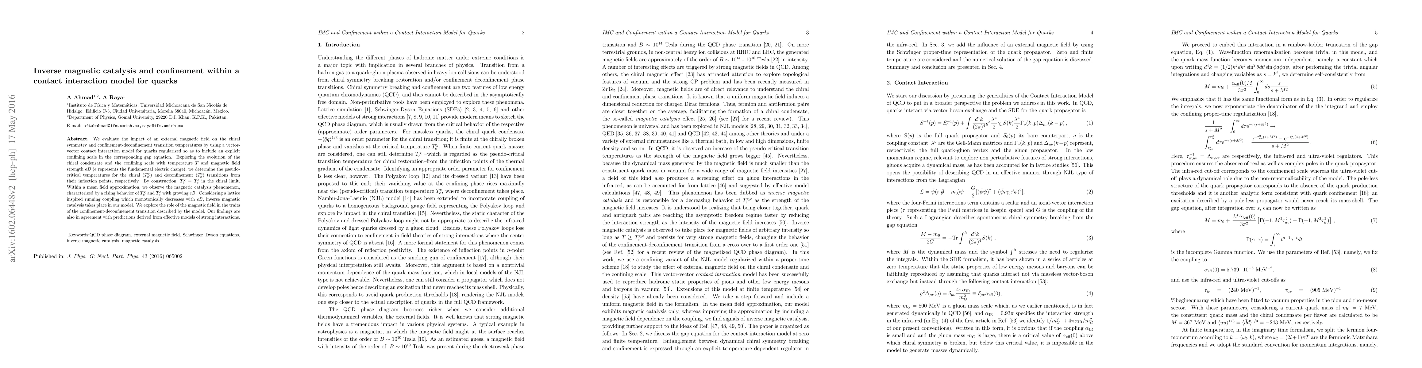 We evaluate the impact of an external magnetic field on the chiral symmetry and confinement-deconfinement transition temperatures by using a vector-vector contact interaction model for quarks regularized so as to include an explicit confining scale in the corresponding gap equation. Exploring the evolution of the chiral condensate and the confining scale with temperature $T$ and magnetic field strength $eB$ ($e$ represents the fundamental electric charge), we determine the pseudo-critical temperatures for the chiral ($T_c^\chi$) and deconfinement ($T_c^c$) transitions from their inflection points, respectively. By construction, $T_c^\chi= T_c^c$ in the chiral limit. Within a mean field approximation, we observe the magnetic catalysis phenomenon, characterized by a rising behavior of $T_c^\chi$ and $T_c^c$ with growing $eB$. Considering a lattice inspired running coupling which monotonically decreases with $eB$, inverse magnetic catalysis takes place in our model. We explore the role of the magnetic field in the traits of the confinement-deconfinement transition described by the model. Our findings are also in agreement with predictions derived from effective models of strong interactions.