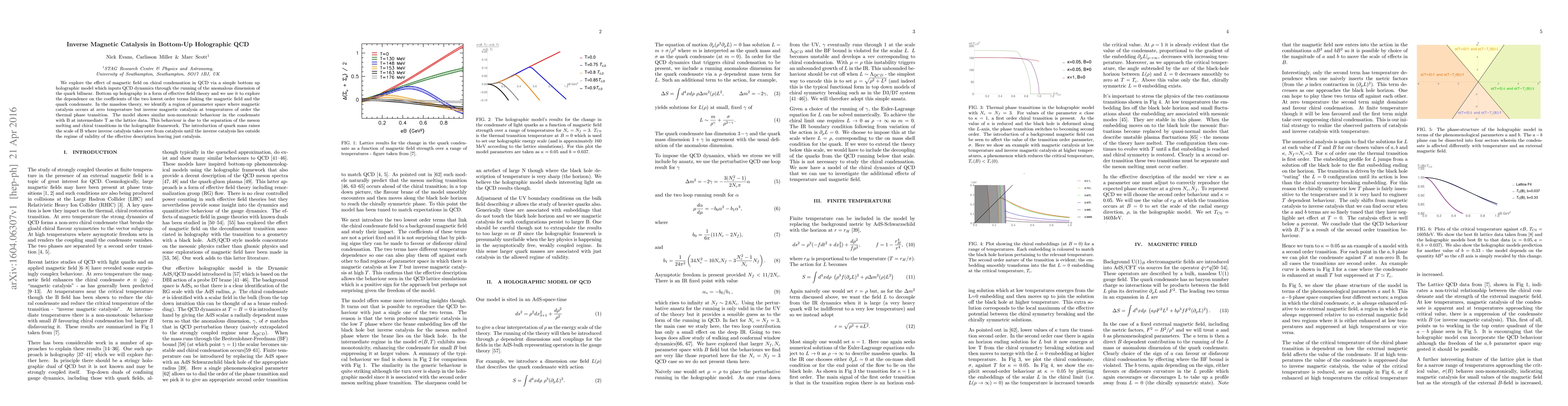 We explore the effect of magnetic field on chiral condensation in QCD via a simple bottom up holographic model which inputs QCD dynamics through the running of the anomalous dimension of the quark bilinear. Bottom up holography is a form of effective field theory and we use it to explore the dependence on the coefficients of the two lowest order terms linking the magnetic field and the quark condensate. In the massless theory, we identify a region of parameter space where magnetic catalysis occurs at zero temperature but inverse magnetic catalysis at temperatures of order the thermal phase transition. The model shows similar non-monotonic behaviour in the condensate with B at intermediate T as the lattice data. This behaviour is due to the separation of the meson melting and chiral transitions in the holographic framework. The introduction of quark mass raises the scale of B where inverse catalysis takes over from catalysis until the inverse catalysis lies outside the regime of validity of the effective description leaving just catalysis.