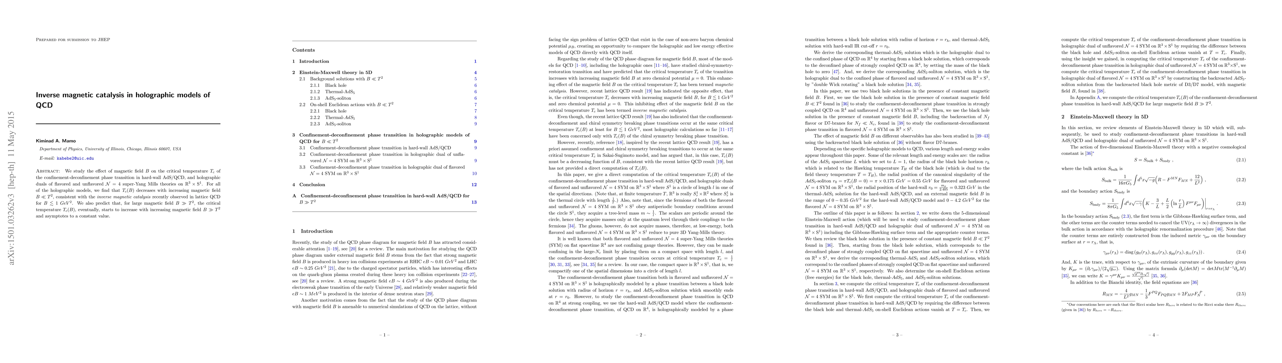We study the effect of magnetic field $B$ on the critical temperature $T_{c}$ of the confinement-deconfinement phase transition in hard-wall AdS/QCD, and holographic duals of flavored and unflavored $\mathcal{N}=4$ super-Yang Mills theories on $\mathbb{R}^3\times \rm S^1$. For all of the holographic models, we find that $T_{c}(B)$ decreases with increasing magnetic field $B\ll T^2$, consistent with the inverse magnetic catalysis recently observed in lattice QCD for $B\lesssim 1~GeV^2$. We also predict that, for large magnetic field $B\gg T^2$, the critical temperature $T_{c}(B)$, eventually, starts to increase with increasing magnetic field $B\gg T^2$ and asymptotes to a constant value.