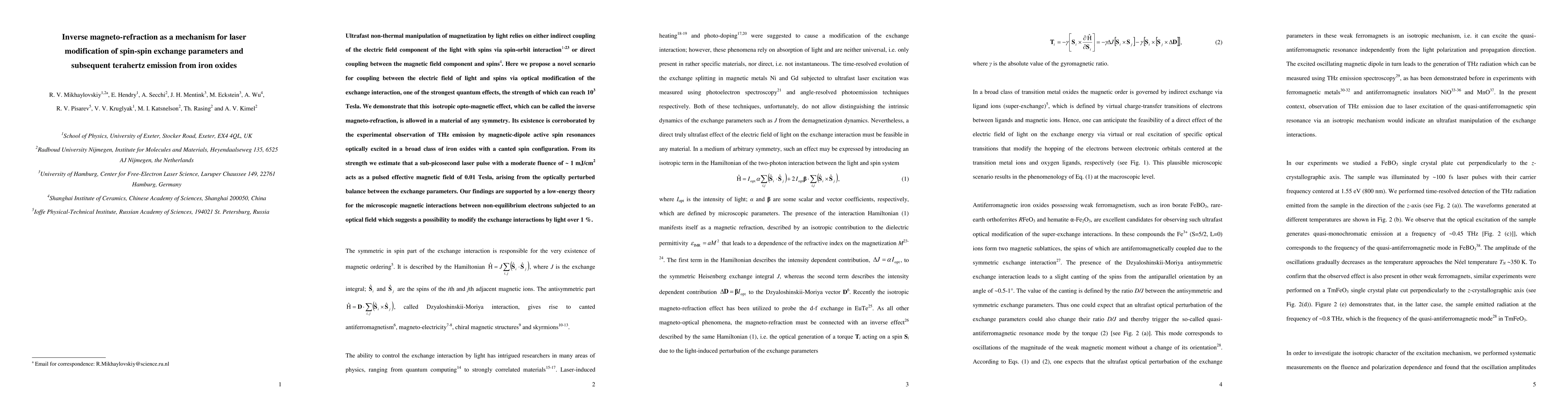 Ultrafast non-thermal manipulation of magnetization by light relies on either indirect coupling of the electric field component of the light with spins via spin-orbit interaction or direct coupling between the magnetic field component and spins. Here we propose a novel scenario for coupling between the electric field of light and spins via optical modification of the exchange interaction, one of the strongest quantum effects, the strength of which can reach 1000 Tesla. We demonstrate that this isotropic opto-magnetic effect, which can be called the inverse magneto-refraction, is allowed in a material of any symmetry. Its existence is corroborated by the experimental observation of THz emission by magnetic-dipole active spin resonances optically excited in a broad class of iron oxides with a canted spin configuration. From its strength we estimate that a sub-picosecond laser pulse with a moderate fluence of ~ 1 mJ/cm^2 acts as a pulsed effective magnetic field of 0.01 Tesla, arising from the optically perturbed balance between the exchange parameters. Our findings are supported by a low-energy theory for the microscopic magnetic interactions between non-equilibrium electrons subjected to an optical field which suggests a possibility to modify the exchange interactions by light over 1 %.