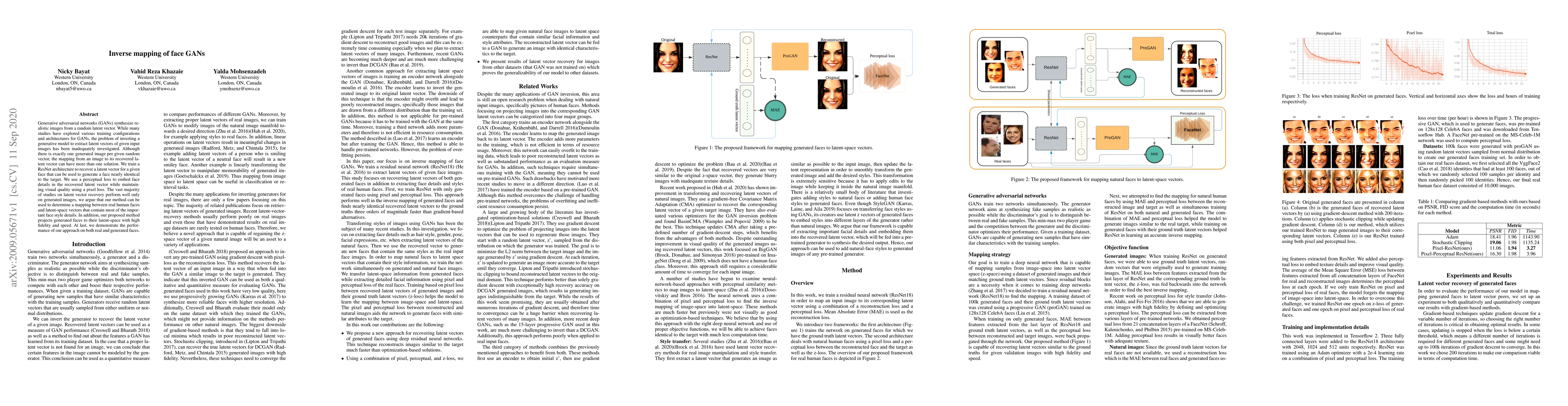 This paper proposes a ResNet-based method to recover latent vectors from given face images, enabling the generation of nearly identical faces. It uses perceptual and pixel losses to maintain visual quality and face details, demonstrating effective mapping between real human faces and latent vectors.