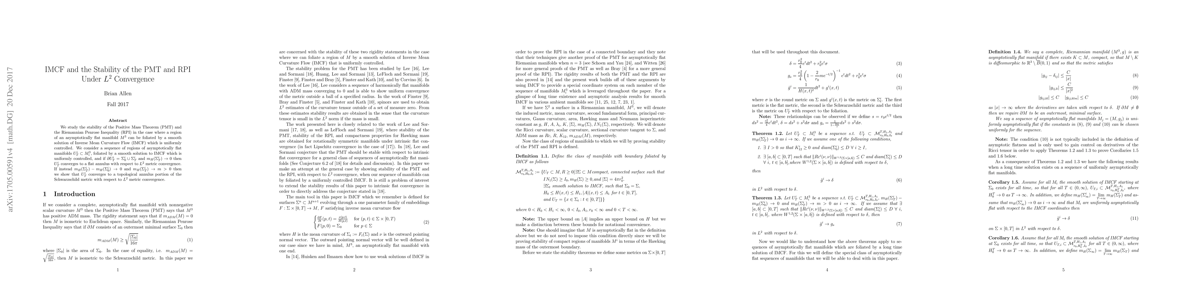 We study the stability of the Positive Mass Theorem (PMT) and the Riemannian Penrose Inequality (RPI) in the case where a region of an asymptotically flat manifold $M^3$ can be foliated by a smooth solution of Inverse Mean Curvature Flow (IMCF) which is uniformly controlled. We consider a sequence of regions of asymptotically flat manifolds $U_T^i\subset M_i^3$, foliated by a smooth solution to IMCF which is uniformly controlled, and if $\partial U_T^i = \Sigma_0^i \cup \Sigma_T^i$ and $m_H(\Sigma_T^i) \rightarrow 0$ then $U_T^i$ converges to a flat annulus with respect to $L^2$ metric convergence. If instead $m_H(\Sigma_T^i)-m_H(\Sigma_0^i) \rightarrow 0$ and $m_H(\Sigma_T^i) \rightarrow m >0$ then we show that $U_T^i$ converges to a topological annulus portion of the Schwarzschild metric with respect to $L^2$ metric convergence.