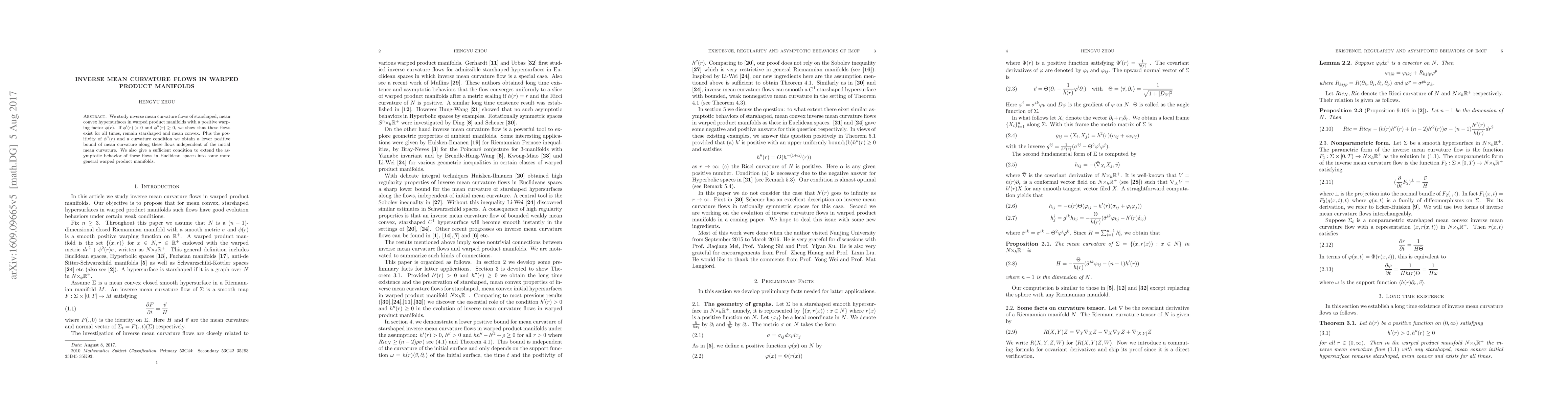 This paper investigates inverse mean curvature flows of starshaped, mean convex hypersurfaces in warped product manifolds with positive warping factor $\varphi(r)$. Under conditions $\varphi'(r)>0$ and $\varphi''(r)\geq 0$, the authors demonstrate that the flows exist indefinitely, remain starshaped and mean convex, and establish a lower bound for mean curvature.