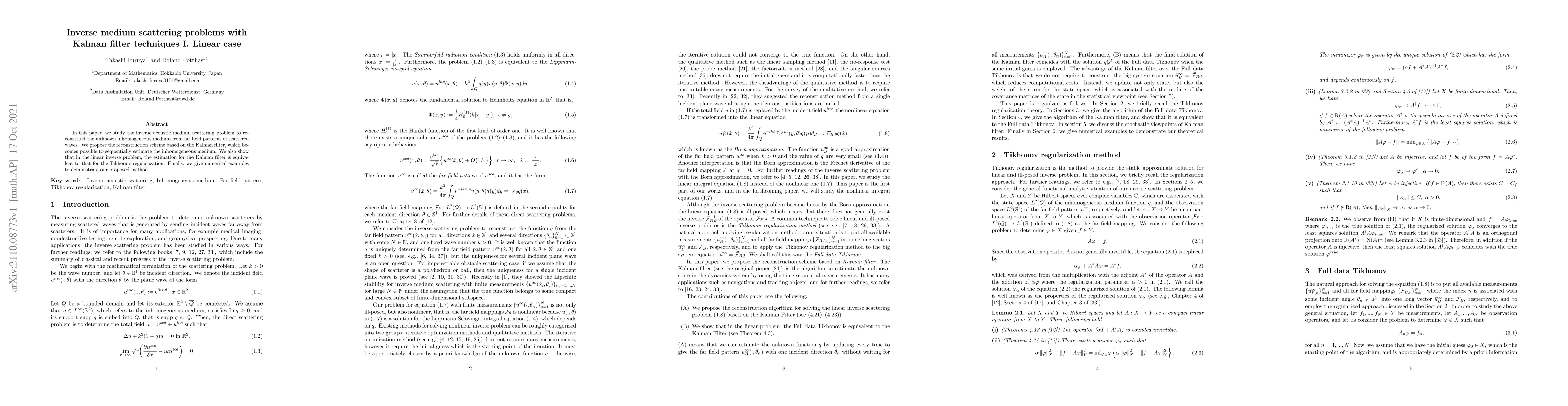 This paper proposes a Kalman filter-based method for reconstructing an inhomogeneous medium from scattered wave patterns, showing its equivalence to Tikhonov regularization in linear inverse problems, and provides numerical examples to validate the approach.