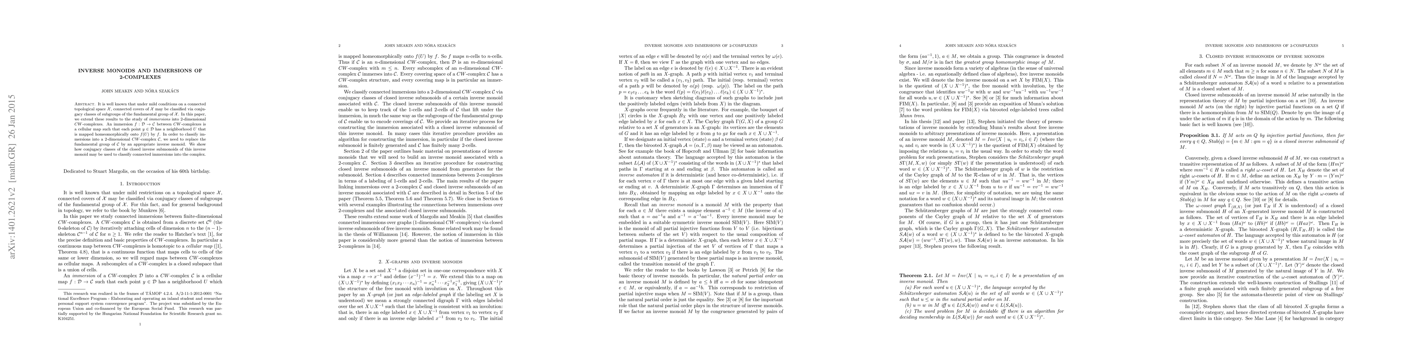 Researchers extend a known result on classifying connected topological spaces via subgroup conjugacy classes to classify immersions into 2-dimensional CW-complexes using inverse monoids.