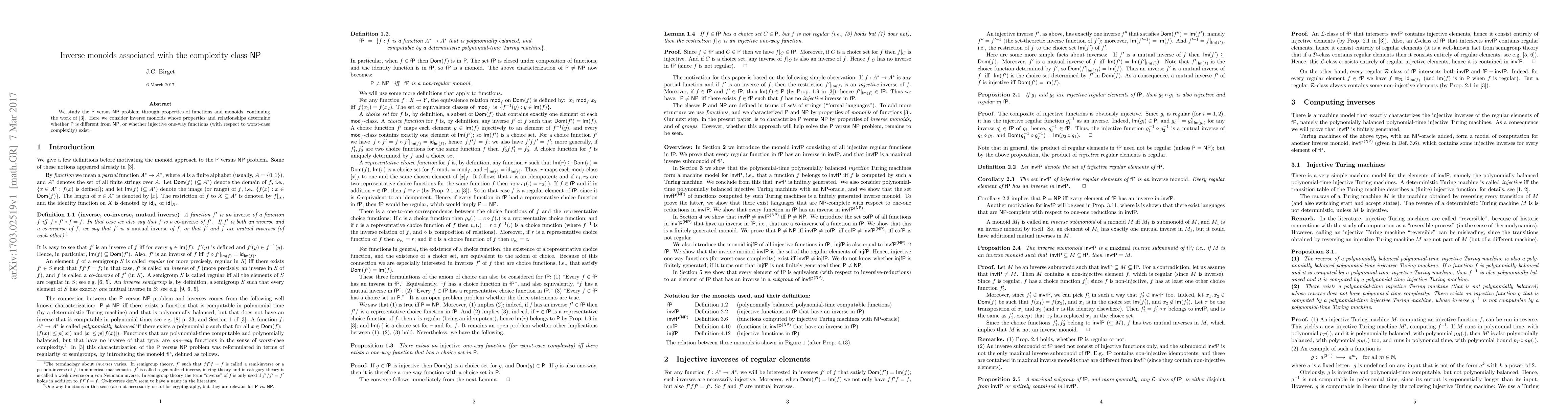 We study the P versus NP problem through properties of functions and monoids, continuing the work of [3]. Here we consider inverse monoids whose properties and relationships determine whether P is different from NP, or whether injective one-way functions (with respect to worst-case complexity) exist.
