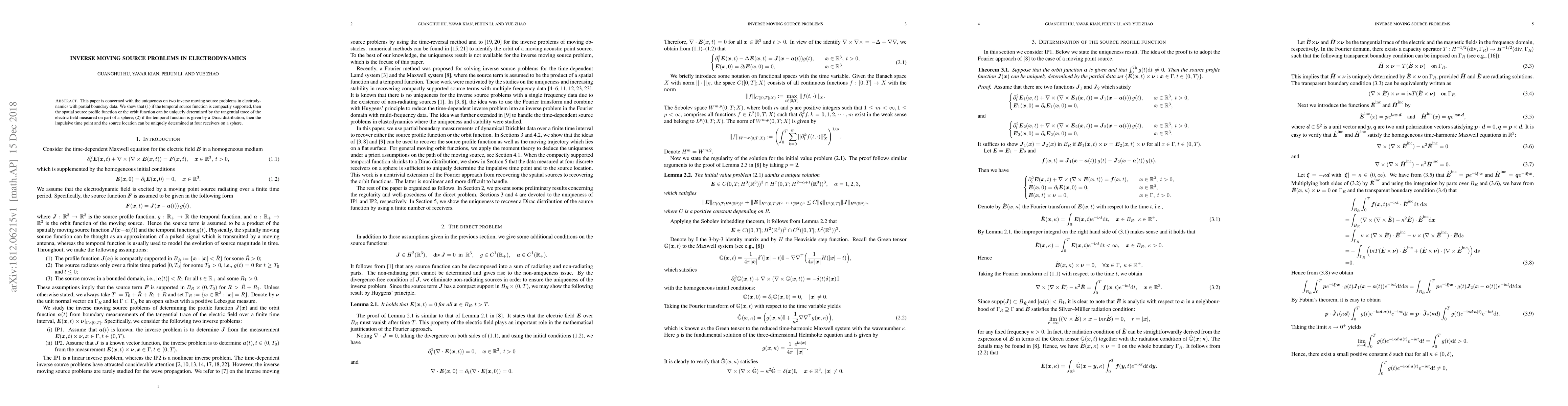 This paper is concerned with the uniqueness on two inverse moving source problems in electrodynamics with partial boundary data. We show that (1) if the temporal source function is compactly supported, then the spatial source profile function or the orbit function can be uniquely determined by the tangential trace of the electric field measured on part of a sphere, (2) if the temporal function is given by a Dirac distribution, then the impulsive time point and the source location can be uniquely determined at four receivers on a sphere.