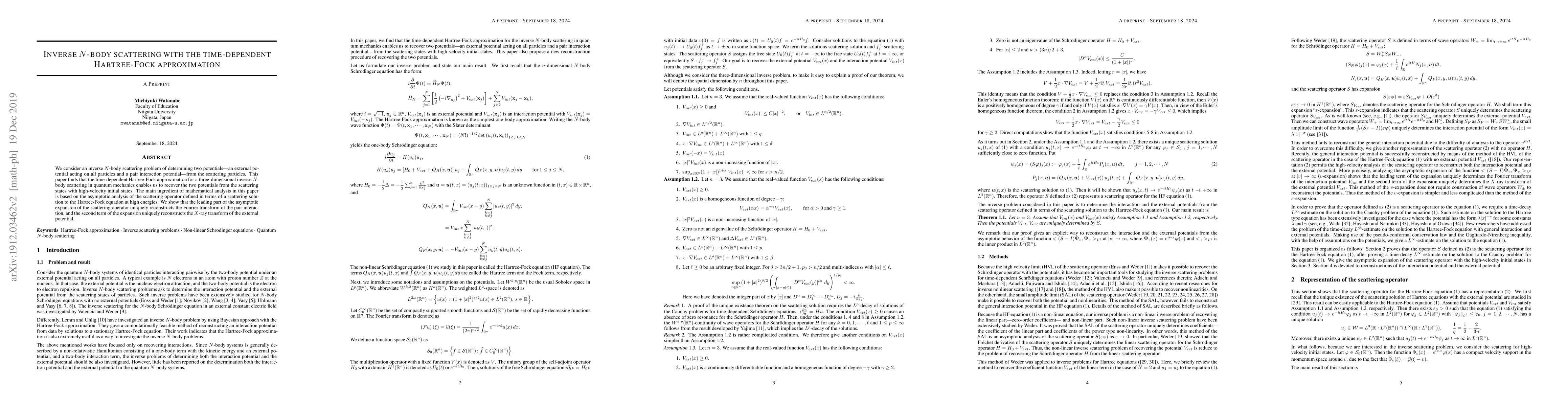 This paper addresses an inverse $N$-body scattering problem using the time-dependent Hartree-Fock approximation to determine two potentials from scattering particles. It demonstrates that the asymptotic analysis of the scattering operator at high energies uniquely reconstructs both the Fourier transform of the pair interaction and the $X$-ray transform of the external potential.