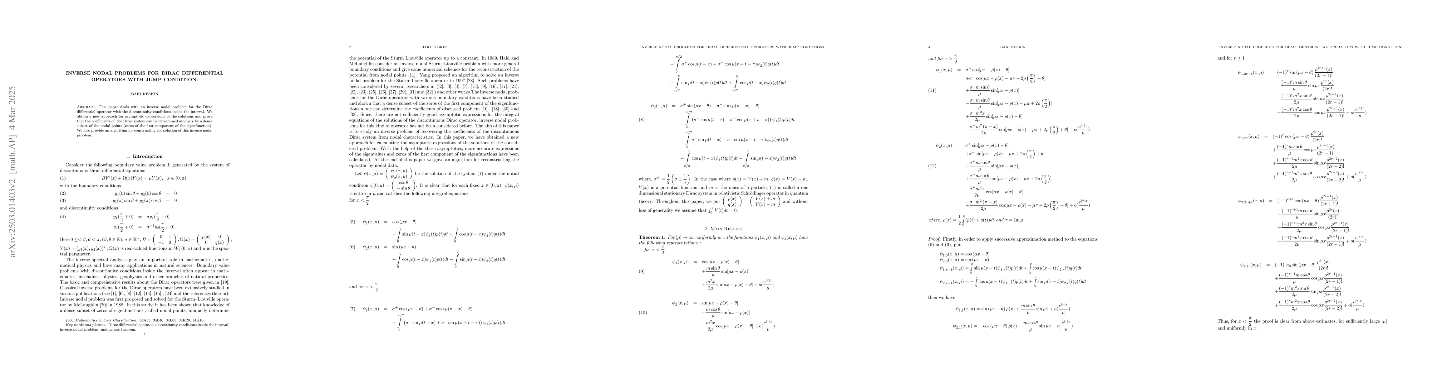 The paper introduces a unique approach for inverse nodal problems using asymptotic expressions and a dense subset of nodal points, providing a novel algorithm for reconstructing Dirac system coefficients.