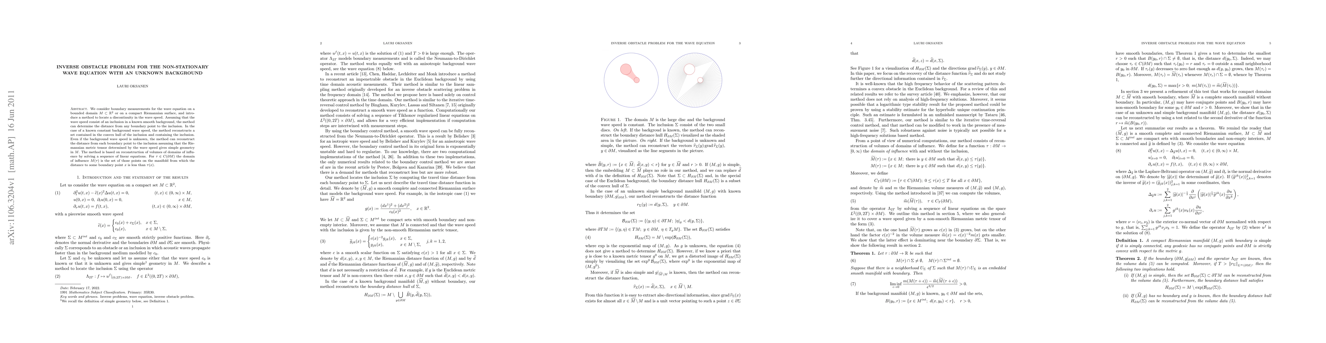 We consider boundary measurements for the wave equation on a bounded domain $M \subset \R^2$ or on a compact Riemannian surface, and introduce a method to locate a discontinuity in the wave speed. Assuming that the wave speed consist of an inclusion in a known smooth background, the method can determine the distance from any boundary point to the inclusion. In the case of a known constant background wave speed, the method reconstructs a set contained in the convex hull of the inclusion and containing the inclusion. Even if the background wave speed is unknown, the method can reconstruct the distance from each boundary point to the inclusion assuming that the Riemannian metric tensor determined by the wave speed gives simple geometry in $M$. The method is based on reconstruction of volumes of domains of influence by solving a sequence of linear equations. For $\tau \in C(\p M)$ the domain of influence $M(\tau)$ is the set of those points on the manifold from which the distance to some boundary point $x$ is less than $\tau(x)$.