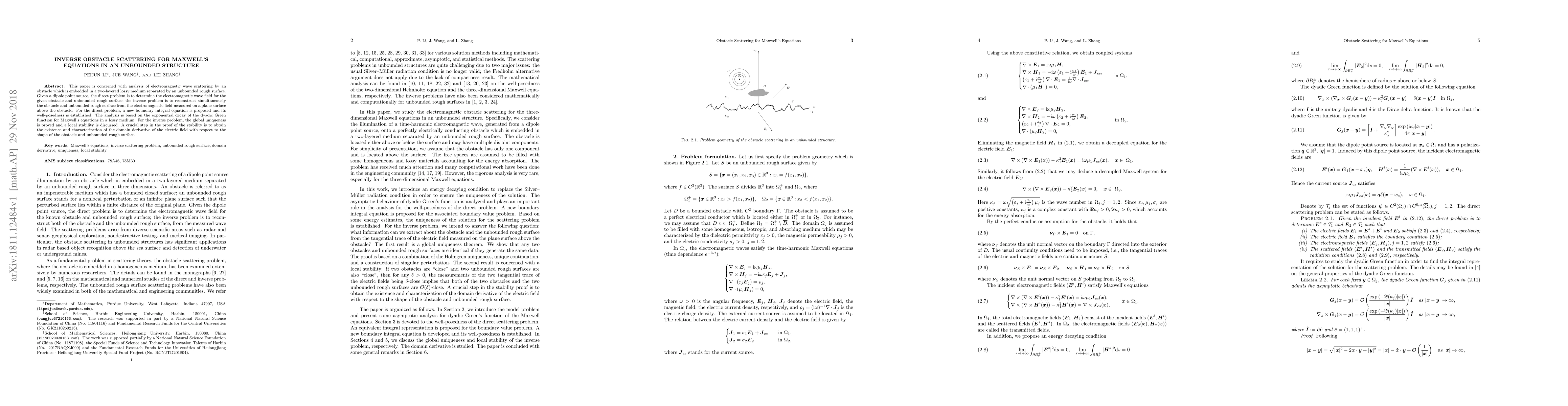 This paper is concerned with analysis of electromagnetic wave scattering by an obstacle which is embedded in a two-layered lossy medium separated by an unbounded rough surface. Given a dipole point source, the direct problem is to determine the electromagnetic wave field for the given obstacle and unbounded rough surface; the inverse problem is to reconstruct simultaneously the obstacle and unbounded rough surface from the electromagnetic field measured on a plane surface above the obstacle. For the direct problem, a new boundary integral equation is proposed and its well-posedness is established. The analysis is based on the exponential decay of the dyadic Green function for Maxwell's equations in a lossy medium. For the inverse problem, the global uniqueness is proved and a local stability is discussed. A crucial step in the proof of the stability is to obtain the existence and characterization of the domain derivative of the electric field with respect to the shape of the obstacle and unbounded rough surface.