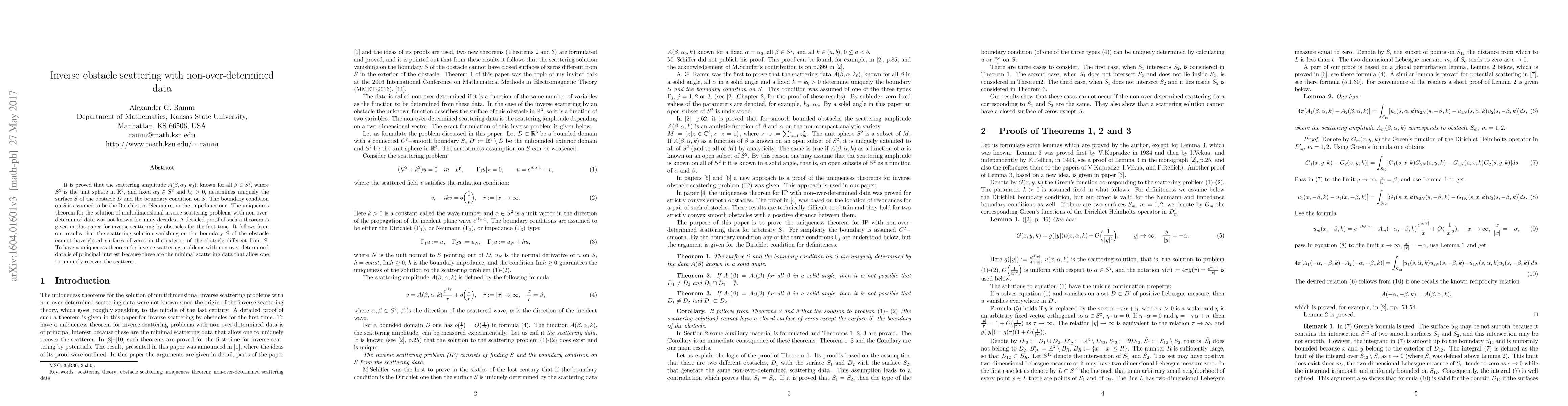 This paper proves a uniqueness theorem for inverse obstacle scattering problems using non-over-determined data, showing that the scattering amplitude uniquely determines the obstacle's surface and its boundary condition, which can be Dirichlet, Neumann, or impedance. This breakthrough resolves a long-standing open question in multidimensional inverse scattering.