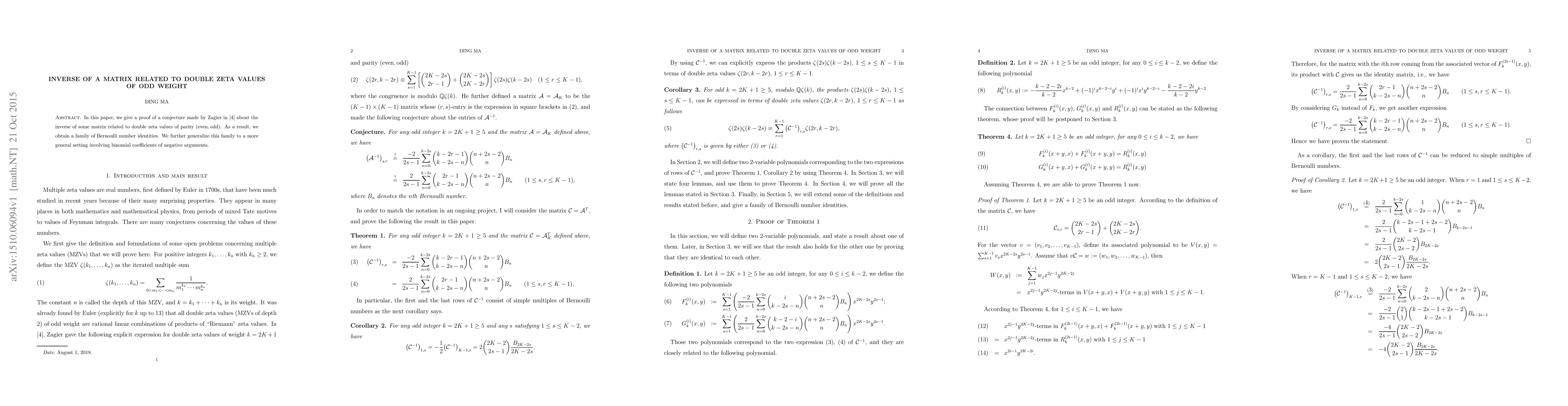 In this paper, we give a proof of a conjecture made by Zagier about the inverse of some matrix related to double zeta values of parity $(\mathrm{even},\mathrm{odd})$. As a result, we obtain a family of Bernoulli number identities. We further generalize this family to a more general setting involving binomial coefficients of negative arguments.