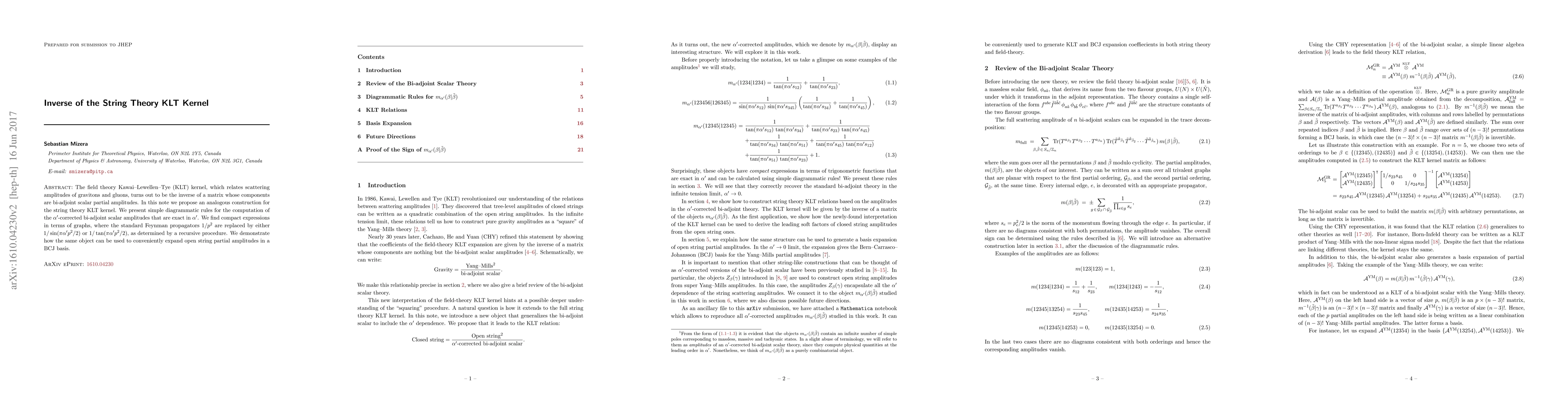 The field theory Kawai-Lewellen-Tye (KLT) kernel, which relates scattering amplitudes of gravitons and gluons, turns out to be the inverse of a matrix whose components are bi-adjoint scalar partial amplitudes. In this note we propose an analogous construction for the string theory KLT kernel. We present simple diagrammatic rules for the computation of the $\alpha'$-corrected bi-adjoint scalar amplitudes that are exact in $\alpha'$. We find compact expressions in terms of graphs, where the standard Feynman propagators $1/p^2$ are replaced by either $1/\sin (\pi \alpha' p^2/2)$ or $1/\tan (\pi \alpha' p^2/2)$, as determined by a recursive procedure. We demonstrate how the same object can be used to conveniently expand open string partial amplitudes in a BCJ basis.