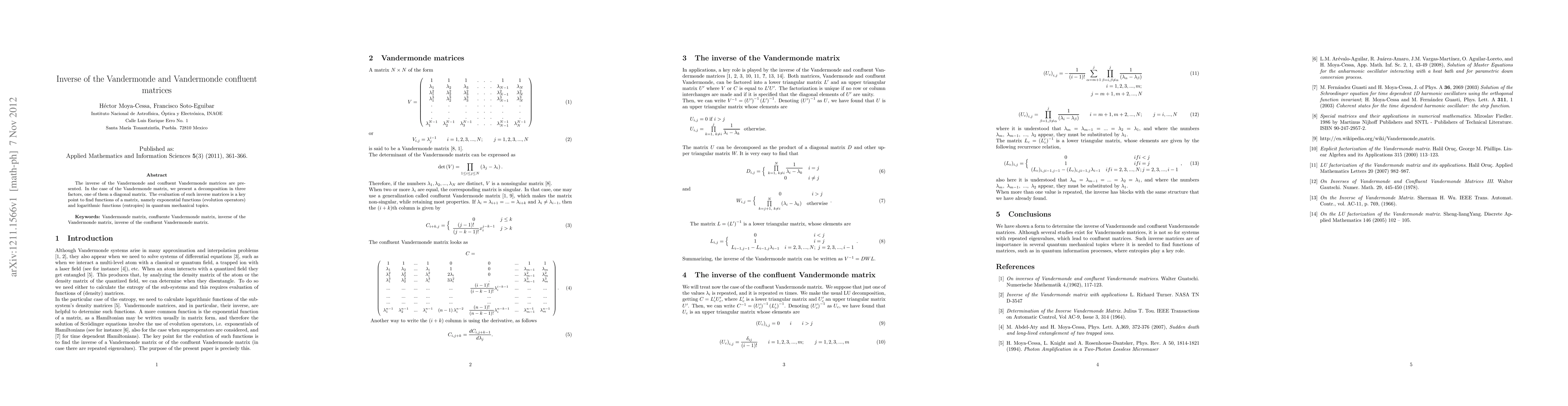 The inverse of the Vandermonde and confluent Vandermonde matrices are presented. In the case of the Vandermonde matrix, we present a decomposition in three factors, one of them a diagonal matrix. The evaluation of such inverse matrices is a key point to find functions of a matrix, namely exponential functions (evolution operators)and logarithmic functions (entropies) in quantum mechanical topics.