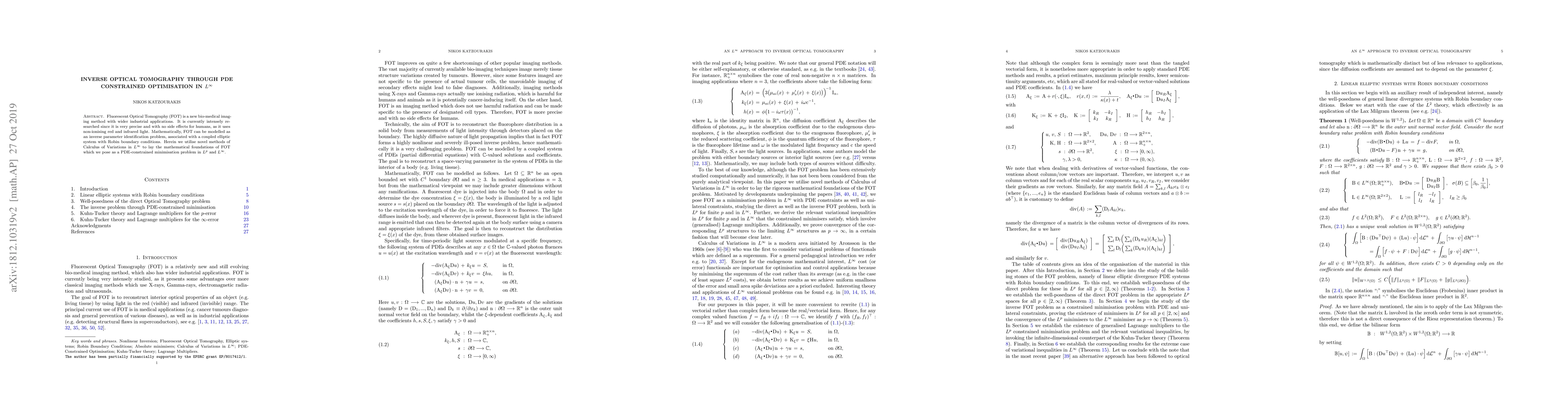 Fluorescent Optical Tomography (FOT) is a new bio-medical imaging method with wider industrial applications. It is currently intensely researched since it is very precise and with no side effects for humans, as it uses non-ionising red and infrared light. Mathematically, FOT can be modelled as an inverse parameter identification problem, associated with a coupled elliptic system with Robin boundary conditions. Herein we utilise novel methods of Calculus of Variations in $L^\infty$ to lay the mathematical foundations of FOT which we pose as a PDE-constrained minimisation problem in $L^p$ and $L^\infty$.