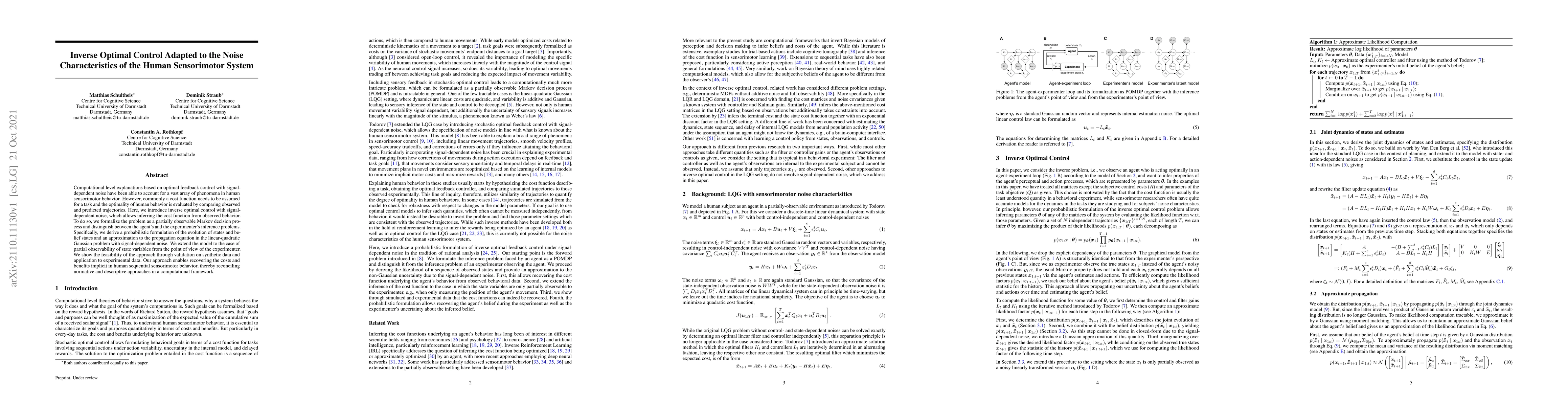 Computational level explanations based on optimal feedback control with signal-dependent noise have been able to account for a vast array of phenomena in human sensorimotor behavior. However, commonly a cost function needs to be assumed for a task and the optimality of human behavior is evaluated by comparing observed and predicted trajectories. Here, we introduce inverse optimal control with signal-dependent noise, which allows inferring the cost function from observed behavior. To do so, we formalize the problem as a partially observable Markov decision process and distinguish between the agent's and the experimenter's inference problems. Specifically, we derive a probabilistic formulation of the evolution of states and belief states and an approximation to the propagation equation in the linear-quadratic Gaussian problem with signal-dependent noise. We extend the model to the case of partial observability of state variables from the point of view of the experimenter. We show the feasibility of the approach through validation on synthetic data and application to experimental data. Our approach enables recovering the costs and benefits implicit in human sequential sensorimotor behavior, thereby reconciling normative and descriptive approaches in a computational framework.