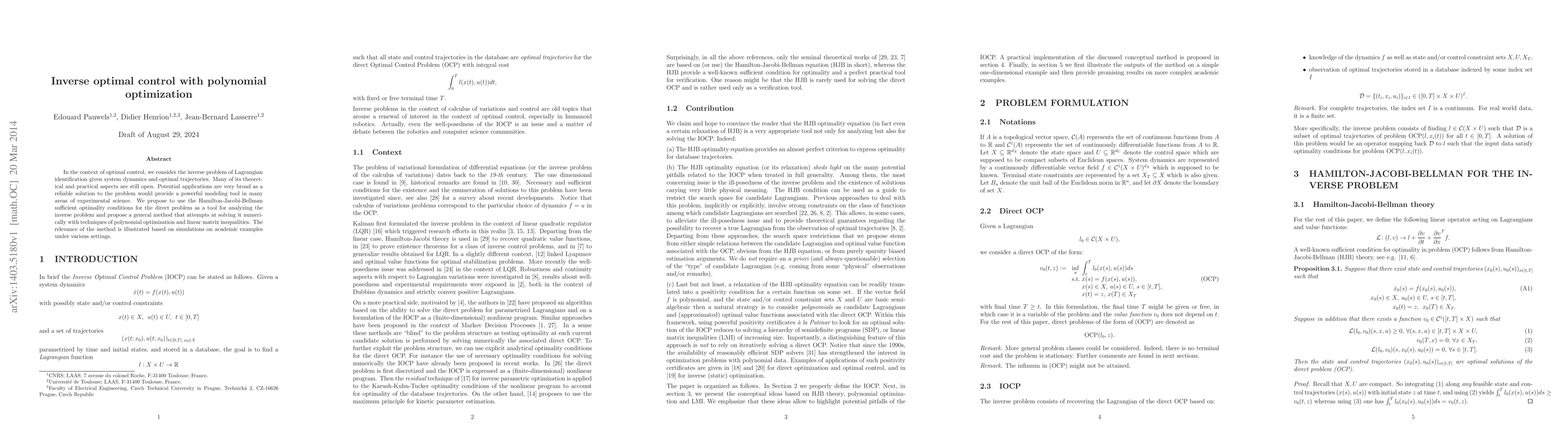 This paper proposes a method for solving the inverse optimal control problem using Hamilton-Jacobi-Bellman conditions and polynomial optimization techniques. Simulations demonstrate the method's effectiveness in identifying system dynamics from given optimal trajectories.