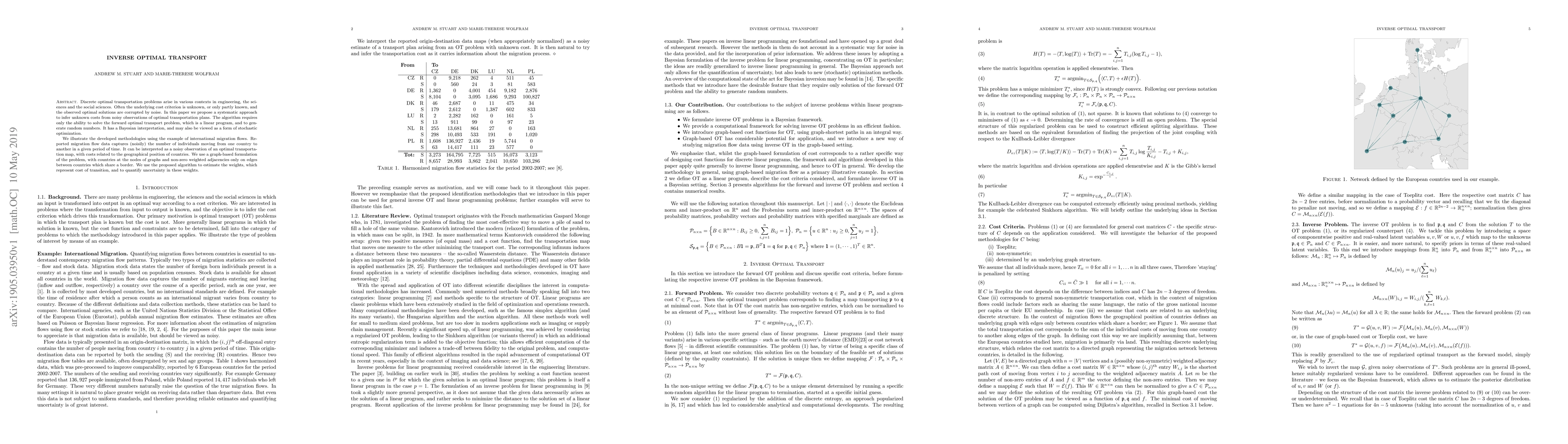 Discrete optimal transportation problems arise in various contexts in engineering, the sciences and the social sciences. Often the underlying cost criterion is unknown, or only partly known, and the observed optimal solutions are corrupted by noise. In this paper we propose a systematic approach to infer unknown costs from noisy observations of optimal transportation plans. The algorithm requires only the ability to solve the forward optimal transport problem, which is a linear program, and to generate random numbers. It has a Bayesian interpretation, and may also be viewed as a form of stochastic optimization. We illustrate the developed methodologies using the example of international migration flows. Reported migration flow data captures (noisily) the number of individuals moving from one country to another in a given period of time. It can be interpreted as a noisy observation of an optimal transportation map, with costs related to the geographical position of countries. We use a graph-based formulation of the problem, with countries at the nodes of graphs and non-zero weighted adjacencies only on edges between countries which share a border. We use the proposed algorithm to estimate the weights, which represent cost of transition, and to quantify uncertainty in these weights.