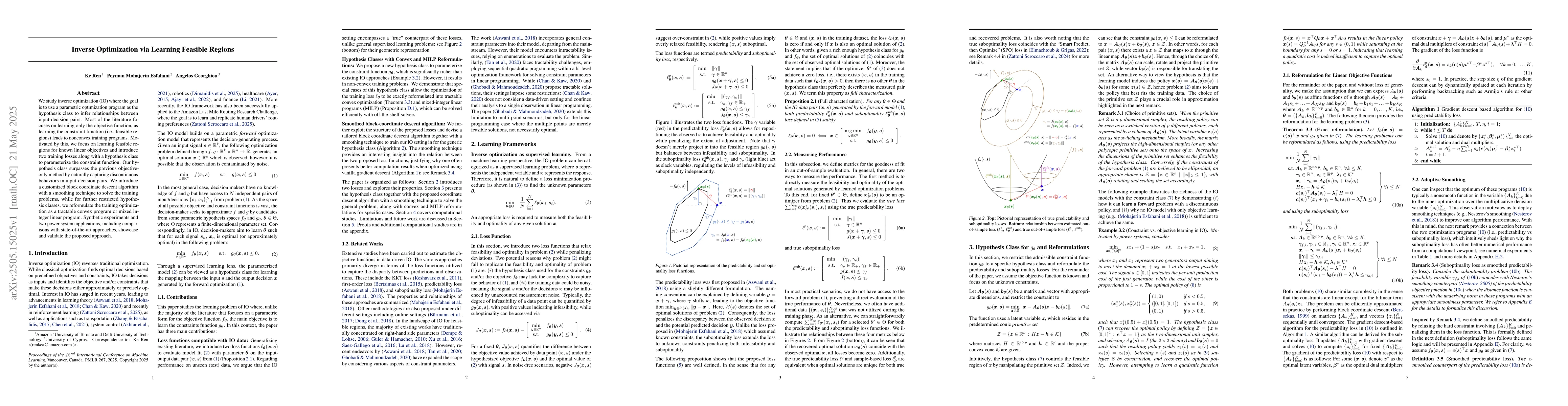 This research is significant as it addresses the challenge of learning constraint functions (feasible regions) in inverse optimization, which has been largely overlooked in favor of objective function learning due to the nonconvexity it introduces. By focusing on feasible regions, the study opens new avenues for more accurate and comprehensive inverse optimization models, particularly useful in fields like power systems and operations research.