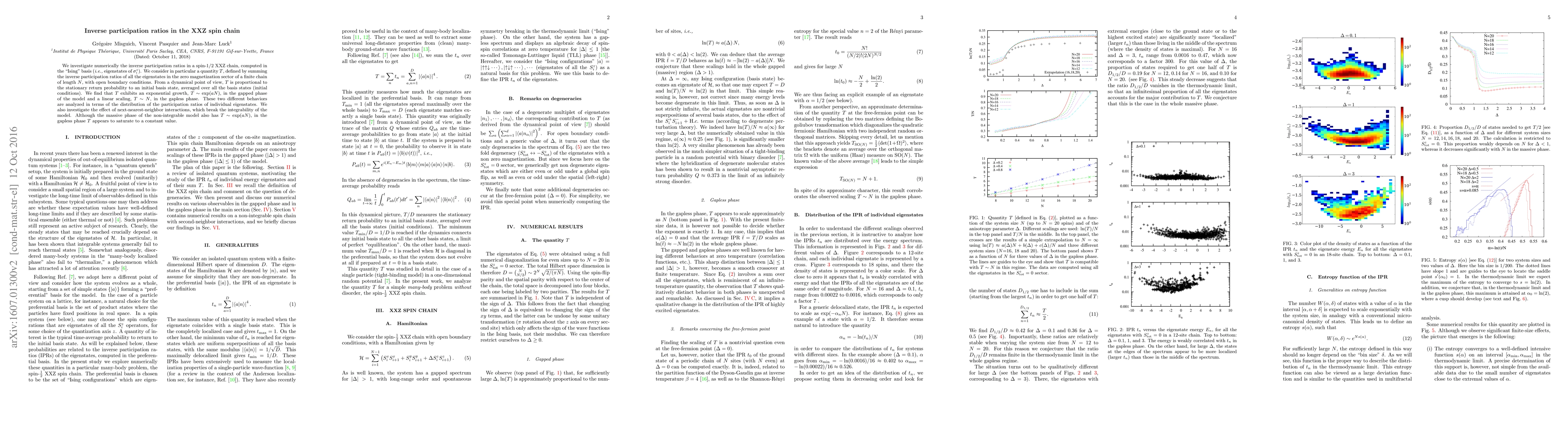 We investigate numerically the inverse participation ratios in a spin-1/2 XXZ chain, computed in the "Ising" basis (i.e., eigenstates of $\sigma^z_i$). We consider in particular a quantity $T$, defined by summing the inverse participation ratios of all the eigenstates in the zero magnetization sector of a finite chain of length $N$, with open boundary conditions. From a dynamical point of view, $T$ is proportional to the stationary return probability to an initial basis state, averaged over all the basis states (initial conditions). We find that $T$ exhibits an exponential growth, $T\sim\exp(aN)$, in the gapped phase of the model and a linear scaling, $T\sim N$, in the gapless phase. These two different behaviors are analyzed in terms of the distribution of the participation ratios of individual eigenstates. We also investigate the effect of next-nearest-neighbor interactions, which break the integrability of the model. Although the massive phase of the non-integrable model also has $T\sim\exp(aN)$, in the gapless phase $T$ appears to saturate to a constant value.