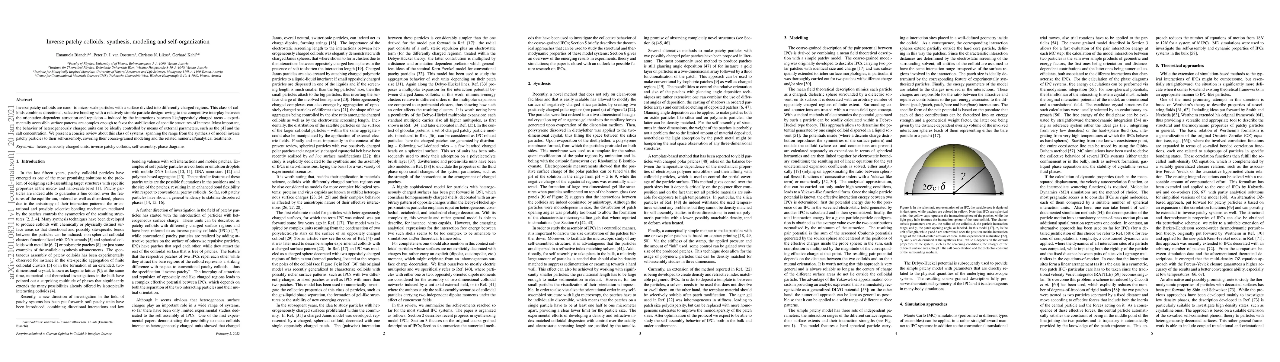 This paper reviews the synthesis, modeling, and self-organization of inverse patchy colloids, which are particles with differently charged regions that enable selective bonding and complex structures. The behavior of these colloids can be controlled by external factors like pH and salt concentration.