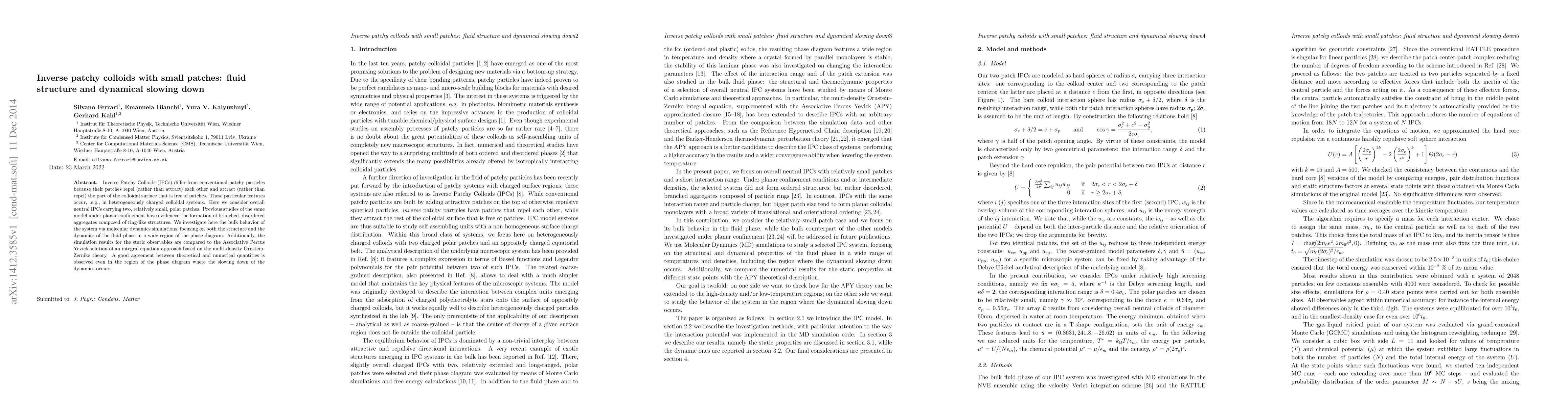 This paper investigates the structure and dynamics of inverse patchy colloids (IPCs) with small repelling patches through molecular dynamics simulations. The study reveals branched, disordered aggregates in the bulk fluid phase and confirms the slowing down of dynamics, with theoretical predictions matching simulation results.