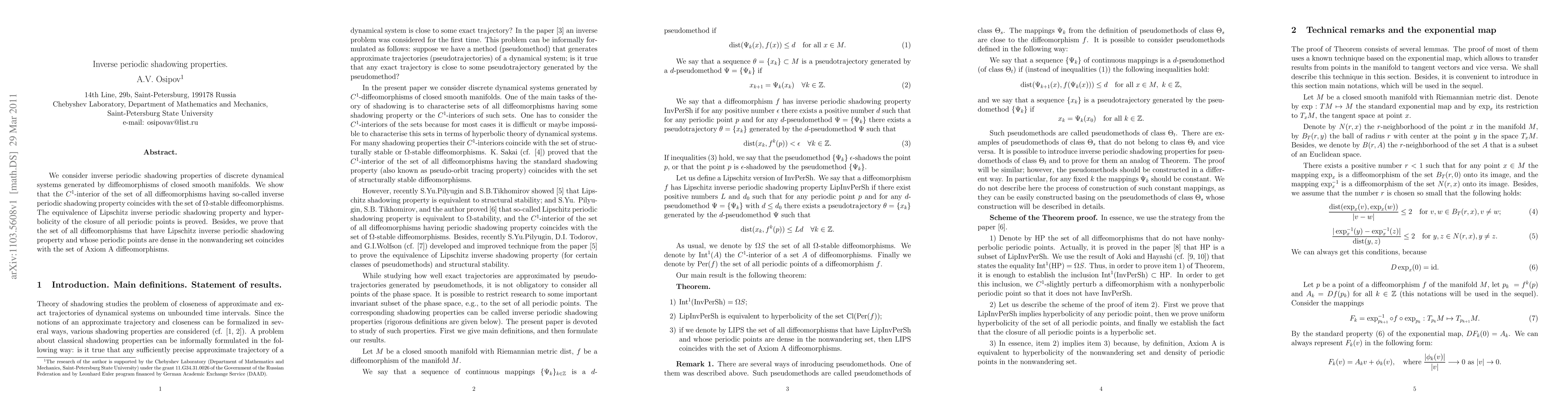 We consider inverse periodic shadowing properties of discrete dynamical systems generated by diffeomorphisms of closed smooth manifolds. We show that the $C^1$-interior of the set of all diffeomorphisms having so-called inverse periodic shadowing property coincides with the set of $\Omega$-stable diffeomorphisms. The equivalence of Lipschitz inverse periodic shadowing property and hyperbolicity of the closure of all periodic points is proved. Besides, we prove that the set of all diffeomorphisms that have Lipschitz inverse periodic shadowing property and whose periodic points are dense in the nonwandering set coincides with the set of Axiom A diffeomorphisms.